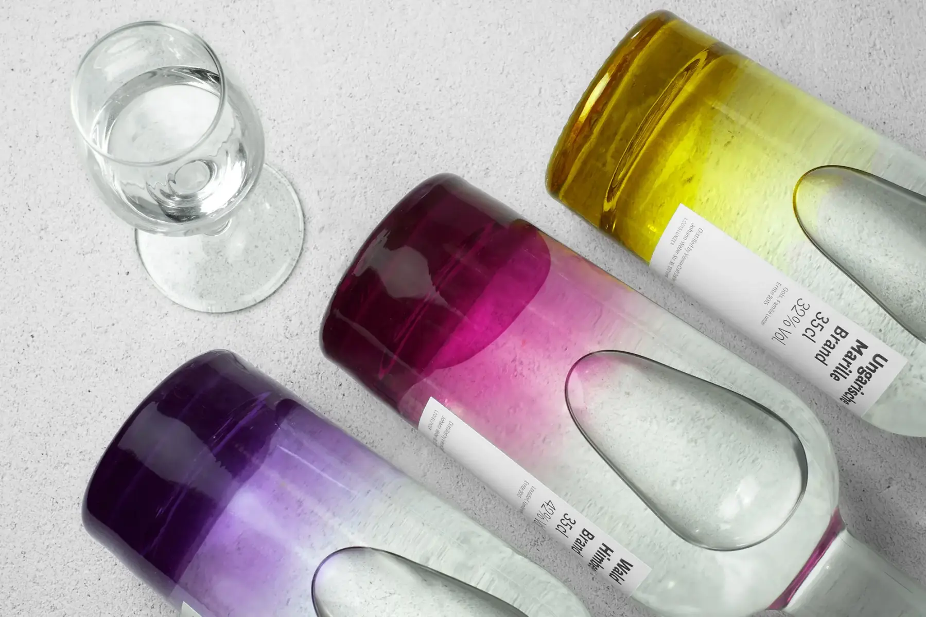 Die klare und reine Essenz aus natürlichen Früchten wird puristisch in Szene gesetzt. Jede Flasche wurde von Hand gefärbt und somit visuell in ein sinnliches und geschmacksreiches Erlebnis getaucht. Die gestalteten Flaschen sorgen dafür, dass es so aussieht wie‘s schmeckt. Und die Brände können sich wirklich schmecken lassen.