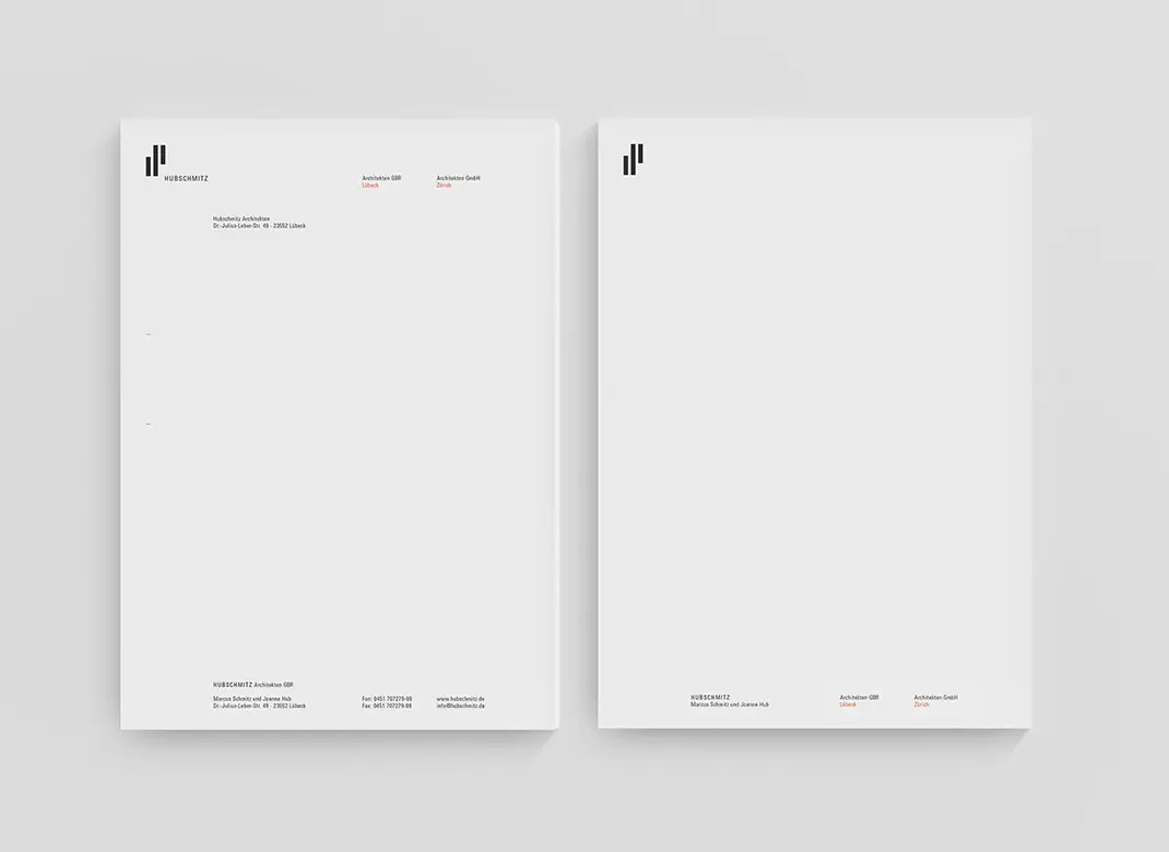 Das Büro Hubschmitz ist vorwiegend im norddeutschen Raum und in der Schweiz tätig und steht für eine klare, sachliche und moderne Architektur. In Logo und Geschäftsaustattung, die Büro Ink für das Unternehmen entwickelt hat, spiegelt sich diese Ästhetik wider.