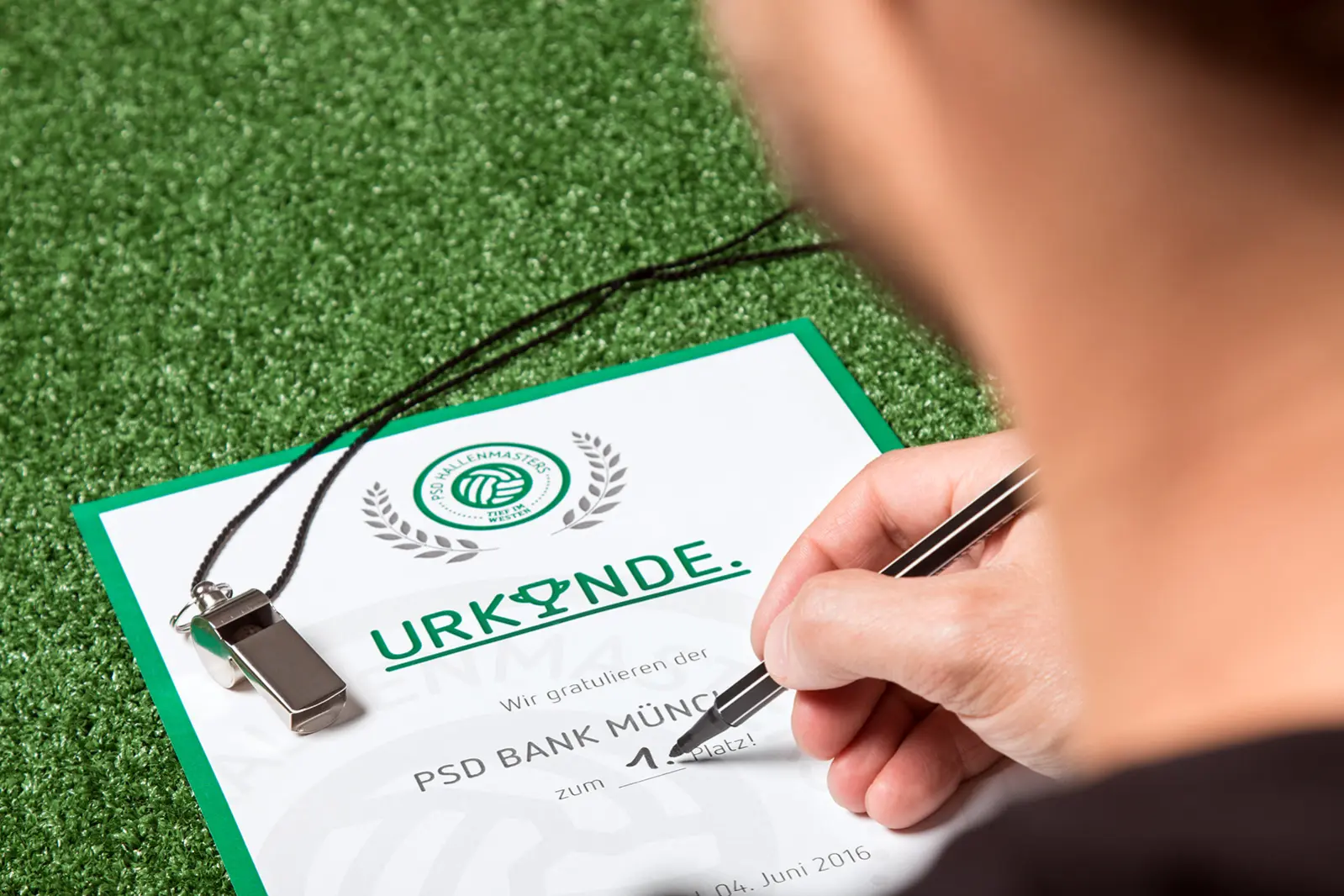 Dortmund im Juni 2016: Fußball, Sonne und gutes Design! Sherpa entwickelte für das Mitarbeiter-Event »PSD Hallenmasters« ein eigenes Branding. In Kombination mit den Gestaltungselementen der PSD Bank Rhein-Ruhr trifft es den Kern: Fußball von der PSD Bank für die PSD Bank. Um die Dynamik und den Austausch der Veranstaltung zu kommunizieren, entwickelt Sherpa den Lattenkracher: Ein Magazin, das vor Ort und in Echtzeit entstand. In 36 Stunden entwickelte und veröffentlichte das »Team Livedesign« 5 Ausgaben – mit topaktuellen Fotos und Ergebnissen des Turniers.