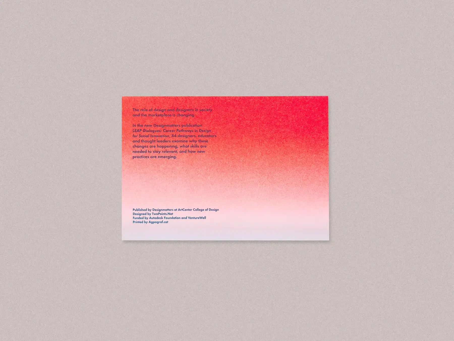 Leap Dialogues: Career Pathways for Designers in Social Innovation wurde von Mariana Amatullo herausgegeben mit Unterstützung von Bryan Boyer, Mitbegründer und Partner von Dash Marshall; Liz Danzico, Creative Director, NPR und Gründungsvorsitzender des MFA Interaction Design Studienganges an der School of Visual Arts und Andrew Shea, Gründer und Geschäftsführer von Many. Die Flexible Visuelle Identität gestaltete TwoPoints.Net Hamburg.