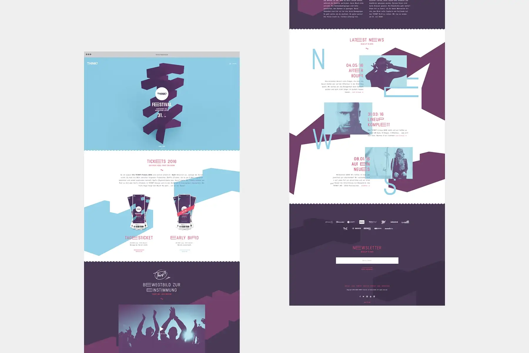 Das Th!nk Festival gehört zu den größten elektronischen Musikveranstaltungen in Mitteldeutschland und zieht einmal im Jahr tausende Musikliebhaber an den Nordstrand des Cospudener Sees im Süden Leipzigs. Bereits das siebte Mal waren wir für die Entwicklung des Keyvisuals, des gesamten grafischen Erscheinungsbildes, der Onlinepräsentation sowie des Leitsystems vor Ort verantwortlich.