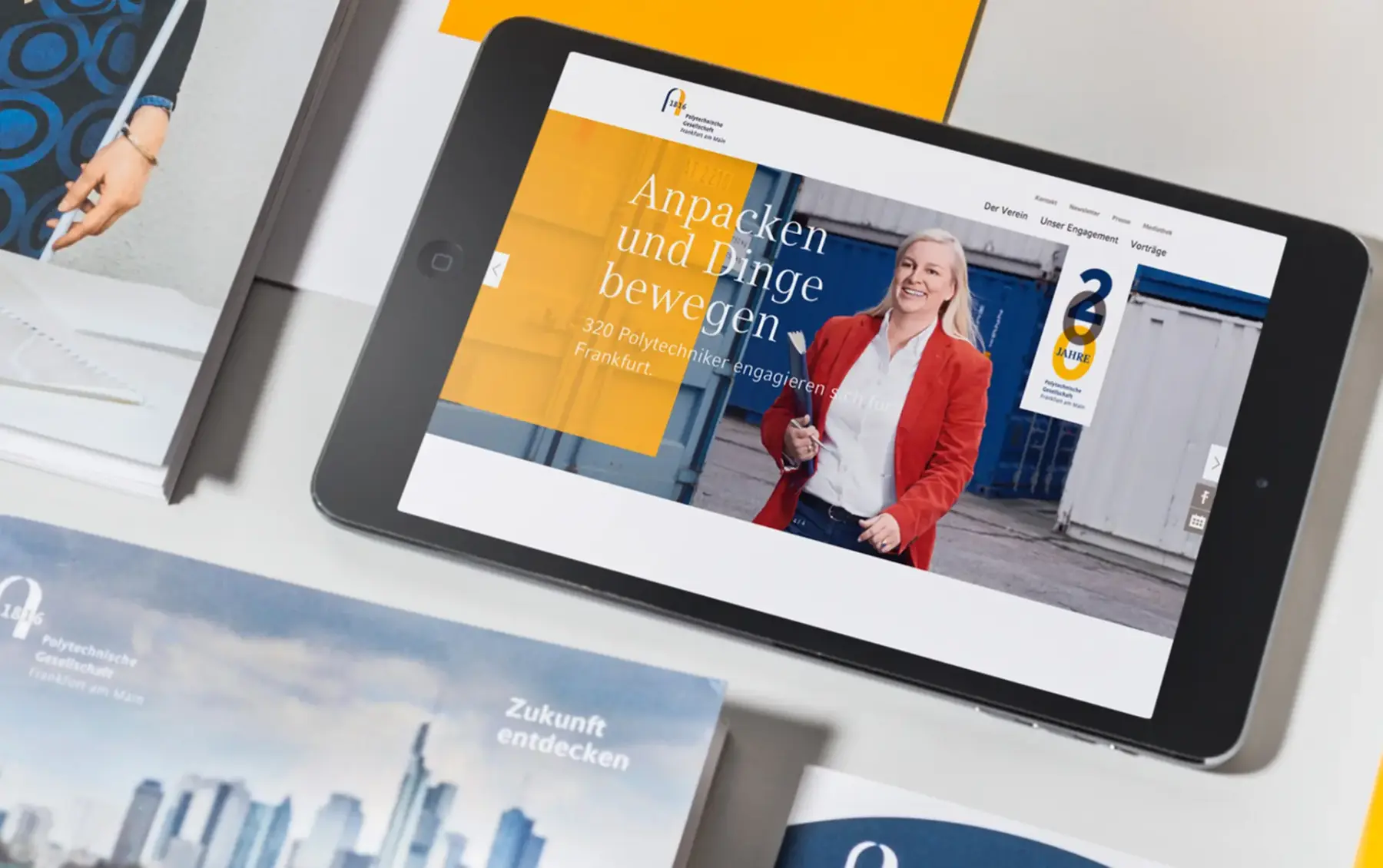 Die wesentlichen Basiselemente des Corporate Design wurden überarbeitet, neu entwickelt und eine Vielzahl an Kommunikationsmedien umgesetzt. Ein eigens entwickeltes Bildkonzept und der markante Einsatz der Corporate Color stärken die Marke der Polytechnischen Gesellschaft und garantieren die Wiedererkennbarkeit in der Frankfurter Stadtgesellschaft.