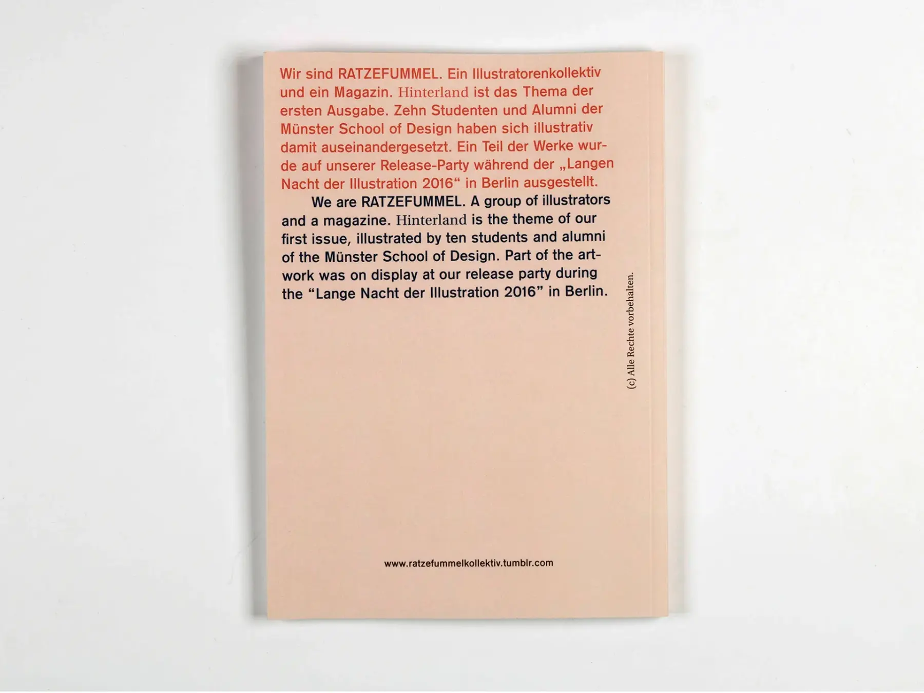 Wir sind Ratzefummel. Ein Illustratorenkollektiv und ein Magazin. Hinterland ist das Thema der ersten Ausgabe. Zehn Studenten und Alumni der Münster School of Design haben sich illustrativ damit auseinandergesetzt. Ein Teil der Werke wurde auf unserer Release-Party während der „Langen Nacht der Illustration 2016“ in Berlin ausgestellt.