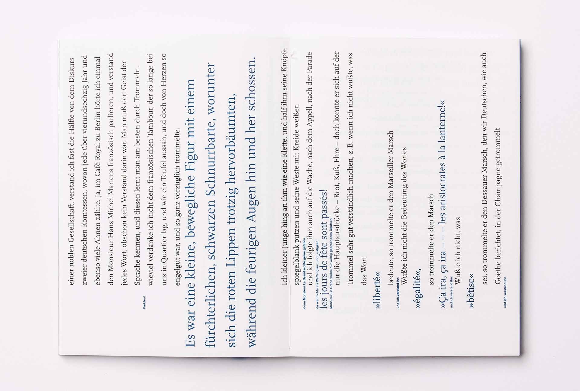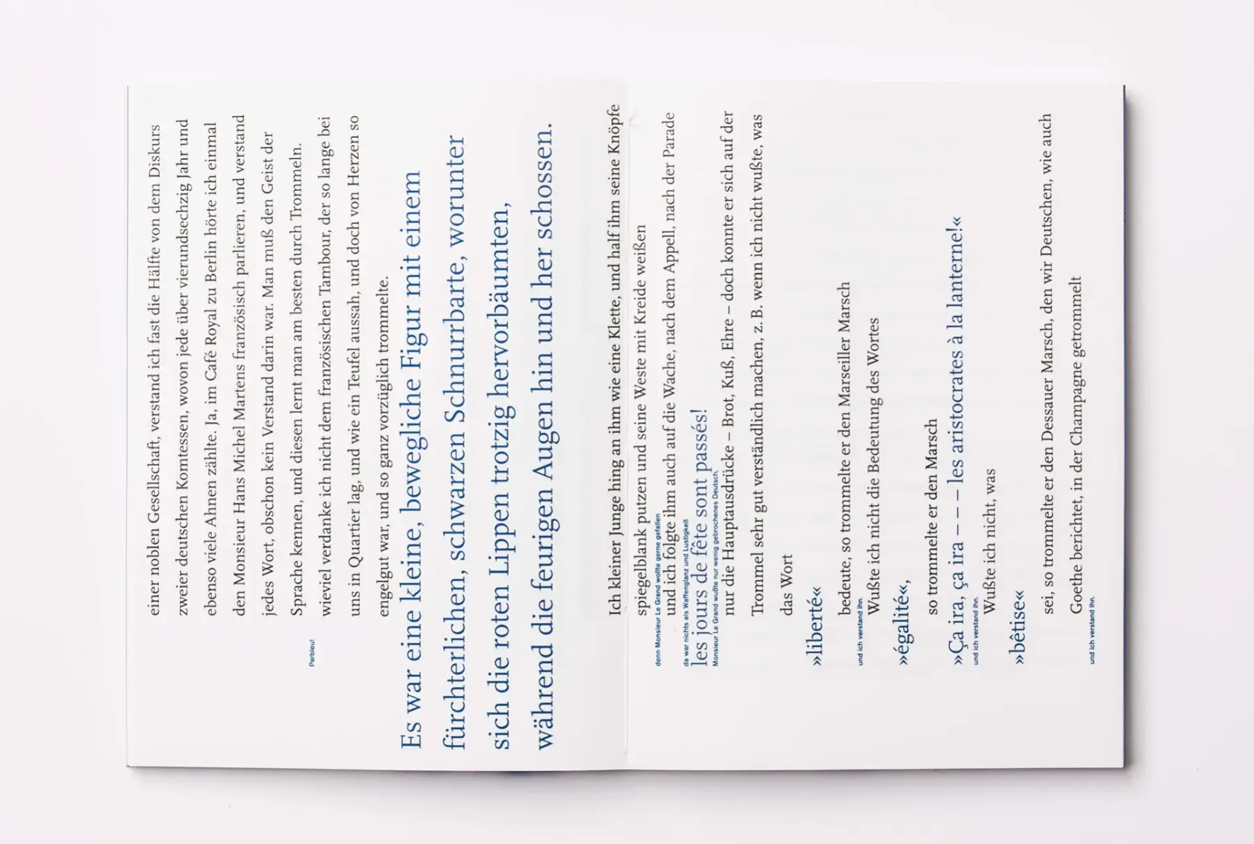 Zwei Semester forschten Studierende an der Fakultät Design der Hochschule Düsseldorf unter der Leitung von Professorin Irmgard Sonnen und Dr. Des. Kathrin Tillmanns mit einer umfassenden Recherche und Neugestaltung zu »Ideen. Das Buch Le Grand« von Heinrich Heine. Die Phänomene Stillstand und Bewegung, der schnelle Wechsel von Stil- und Sprachebenen, das Überschreiten von Gattungsgrenzen, das Prinzip der Collage, der Gegensatzpaare wurden durch entsprechende Gestaltungselemente für Typografie, Layout und Bildsprache untersucht. Es entstanden Bildkonzepte in Form von Fotografien oder Fotomontagen, immer mit dem Ziel, eine dialogische Funktion zu den Texten Heines herzustellen, die für den Betrachter eine eigene Reflexionsebene öffnen. Entwickelt wurden medienspezifische Gestaltungen für das Buch als Objekt, das Medium Plakat und eine Lichtinstallation.