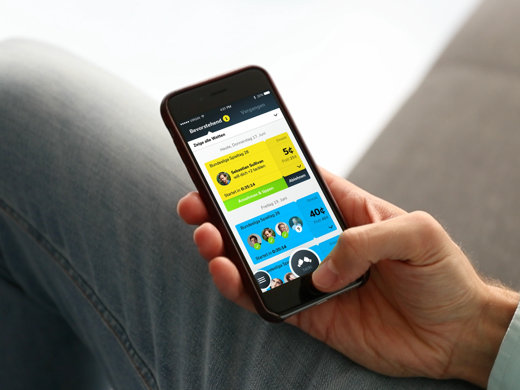 Anstatt eine ganze Spielzeit lang in einer festen Gruppe auf alle Spiele zu tippen, kannst du bei Tackl spontan eine beliebige Anzahl von Freunden zu Partien deiner Wahl herausfordern – und den Einsatz festlegen. Entweder in einer fiktiven Währung (Credits) oder auch in Form eines Sacheinsatzes, z.B. einem Bier.