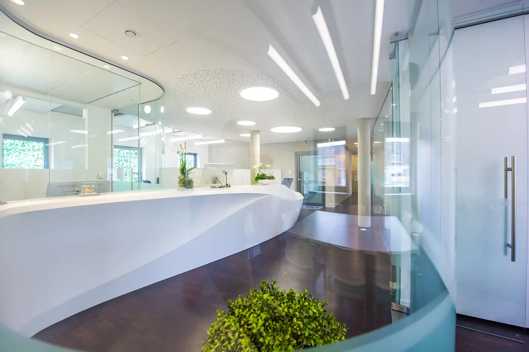 Ein monolithisch wirkendes Objekt aus weißen Acrylstein präsentiert sich als ästhetisch aufgeladene Visitenkarte, welche die externe und interne Unternehmenskommunikation und -philosophie der neu gestalteten Zahnarztpraxis transportiert. Die geschwungene Form der 7m langen und fugenlosen Empfangsplastik integriert formal die ergonomischen Anforderungen an den Arbeitsplatz. Das Objekt zieht sich als weißes Band durch den Raum und verbindet auf spielerische Art und Weise das Sitzen und Stehen. Das skulpturale und zeitgenössische Objekt verbindet eine dynamische Formensprache mit funktionalen und ergonomischen Anforderungen und zitiert bspw. automotive Designkontexte. Wichtige Geräte wie Computer, Drucker, Scanner, Kartenlesegeräte aber auch Ordner und Dokumente finden unmittelbaren Zugriff. Das biomorphe Objekt bildet zudem den Ausgangspunkt für das gestalterische Gesamtkonzept der Arztpraxis. Die organische Formensprache, die Materialität und die Idee der Bewegung und Linienführung setzen sich in der Raumgestaltung fort. Im Empfangsbereich entsteht eine helle und freundliche Atmosphäre. Die gekrümmten Glasflächen schmiegen sich dem Empfangsobjekt an und entwickeln sich von dort in den Raum. Sie bilden für den Patienten eine bauliche Orientierungshilfe und leiten zu den Behandlungsräumen. Die Glasflächen werden in transparente, transluzente und opake Bereiche ausdifferenziert. Dadurch können Funktionsbereiche mit unterschiedlichen Anforderungen an Transparenz oder Intimität geschaffen werden.