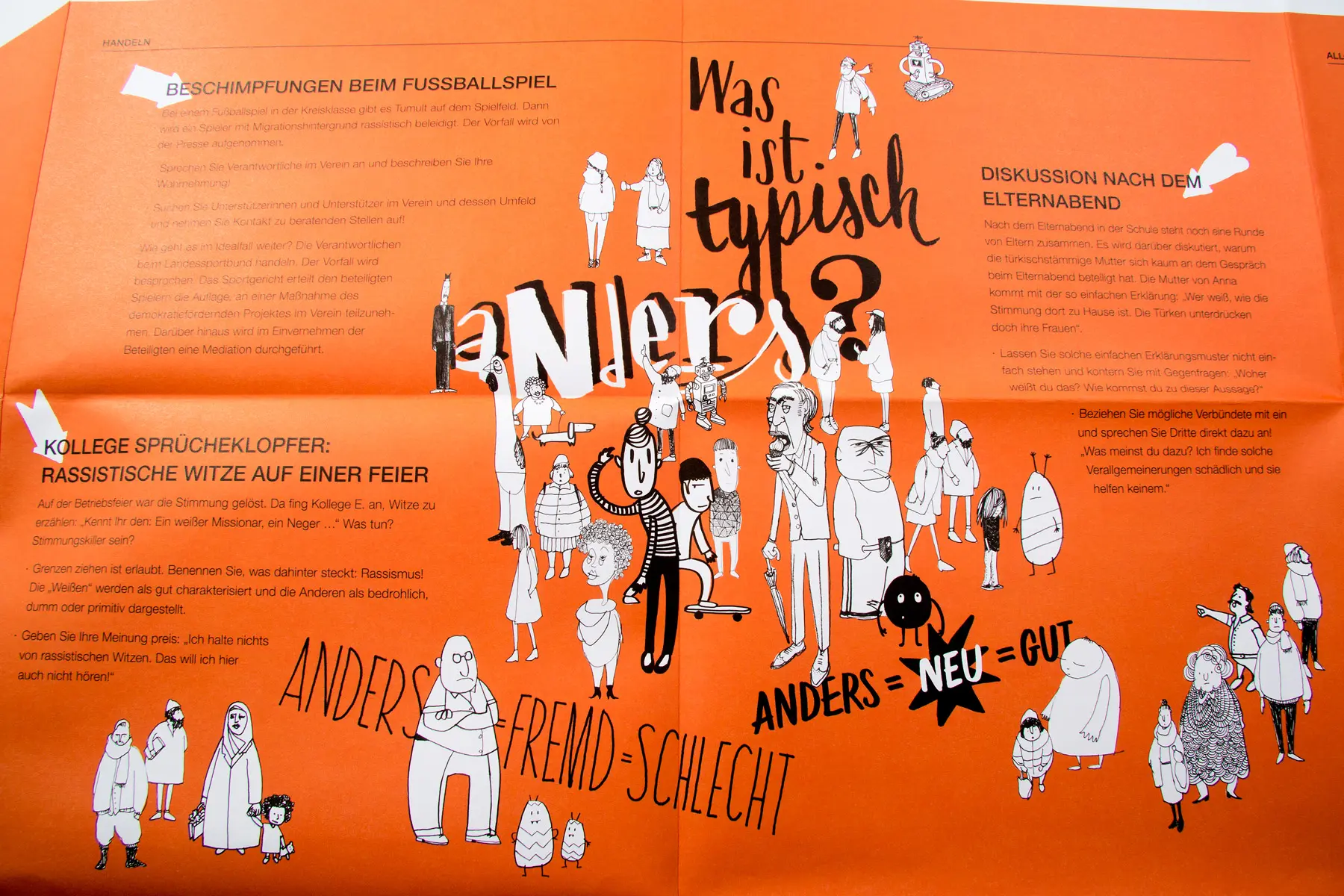 Die Plakate sind eine Hilfestellung für jede/n – im Privat- oder Berufsleben, Unternehmen oder Verein. Sie machen anschaulich, wie Diskriminierung funktioniert, wie Vorurteile entstehen und was Diskriminierung für die Betroffenen bedeutet. Anhand von Beispielen werden Handlungstipps gegeben sowie mögliche Entgegnungen und Reaktionen auf diskriminierende Vorurteile aufgezeigt: Wie reagiere ich zum Beispiel, wenn jemand einen diskriminierenden oder anzüglichen Witz macht?