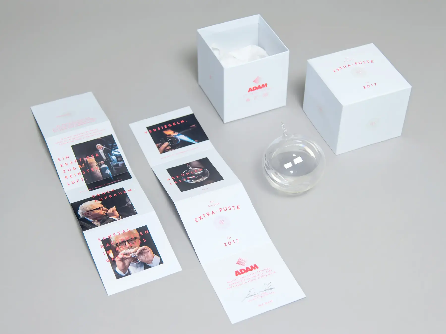 Damit Adam-Kunden all Ihren Aufgaben im neuen Jahr mit langen Atem begegnen können, haben wir qualitativ hochwertige Puste in einer gläsernen Christbaumkugel konserviert, um ihnen damit symbolisch Kraft für 2017 zu schenken.