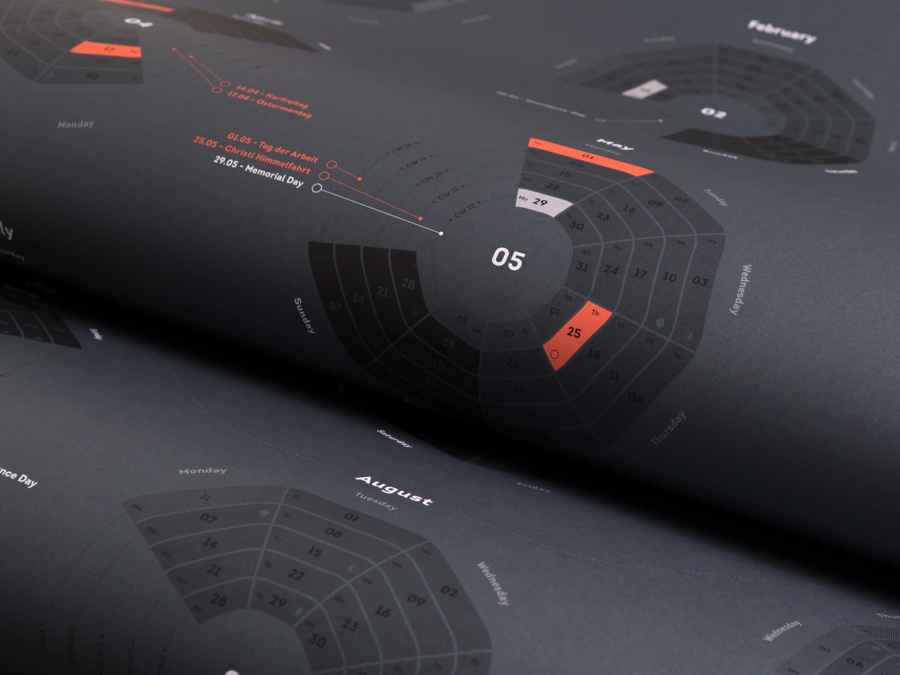 Jeder Monat steht in einer konzentrischen Form, die in der natürlichen Leserichtung auf dem Format verteilt sind. Unterteilt in 4 Zeilen werden die 4 Quartale im Jahr ausgezeichnet. Innerhalb der Monate verlaufen die Tage von Außen nach Innen, wobei jeder Ring eine Kalenderwoche darstellt. Die bundesweiten Feiertage sind farbig hervorgehoben, in Pantone 171 U (Lachs) für Deutschland und in hellgrau für die USA.
