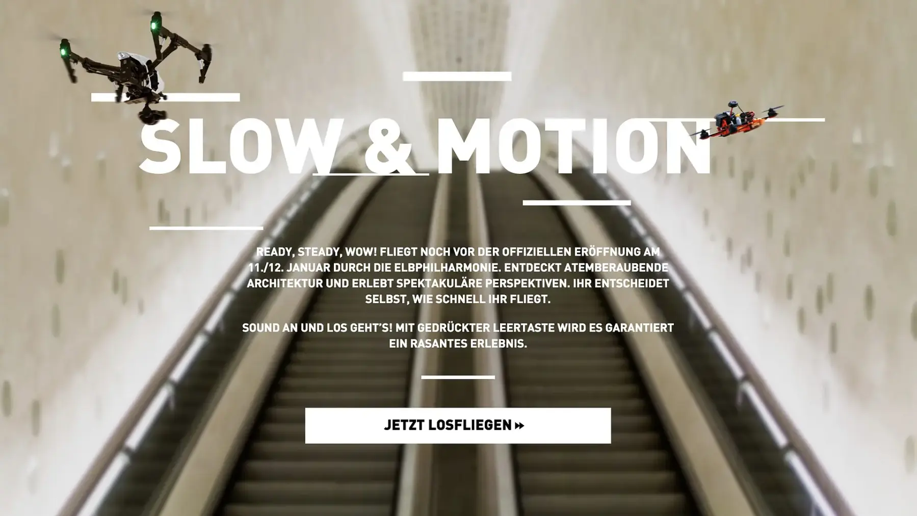 Mit den beiden Drohnen Slow & Motion lädt die Elbphilharmonie Hamburg dazu ein, die beeindruckende Architektur des neuen Konzerthaus noch vor ihrer Eröffnung im Januar 2017 interaktiv von innen zu entdecken. Das Besondere dabei: Die Geschwindigkeit des Drohnen-Fluges können die User selber bestimmen. Mit der Leertaste (Mobiltelefon durch Berühren des Bildschirms) wechselt man zwischen den beiden Drohnen während des Fluges hin- und her.