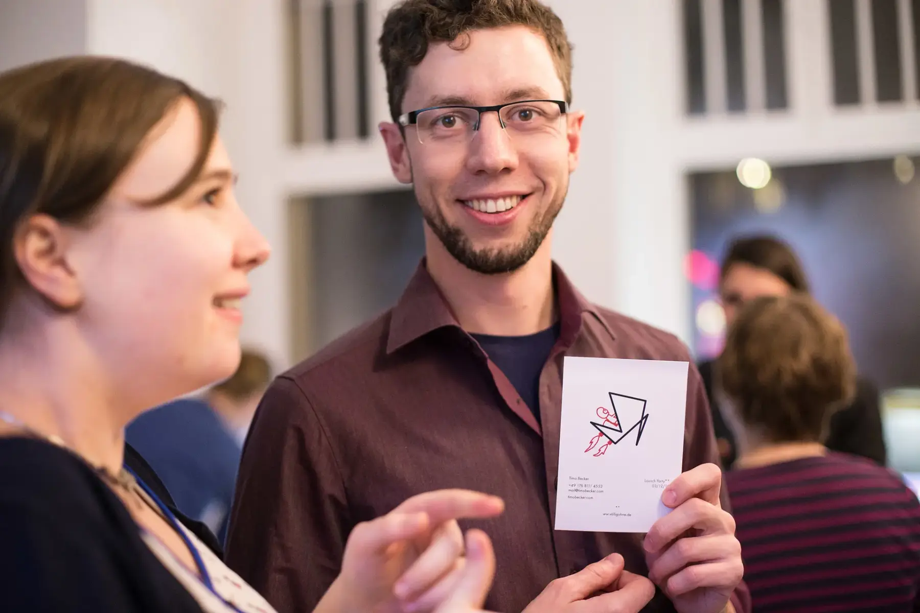 1. Timo reicht seine Visitenkarte mit einem schwarzen Stift und der Bitte, die Punkte zu verbinden.