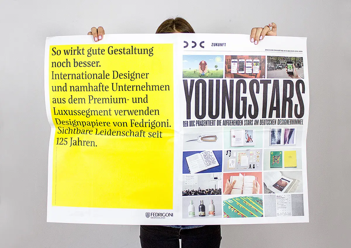 Durch das DDC Zukunftsmagazin soll den vom Deutschen Designer Club alljährlich ausgezeichneten, jungen Gestaltern eine Plattform für die Präsentation ihrer Arbeiten geboten werden. Entwickelt wird das Gestaltungskonzept des Magazins jedes Jahr neu im Zuge eines studentischen Wettbewerbs an der Hochschule RheinMain. 2015 konnte das Konzept »DDC Youngstars« in Form einer Zeitung im Format DIN A2 die Jury um den DDC Vorstand überzeugen. Das Format gibt den eingereichten Arbeiten genügend Platz um zu wirken.