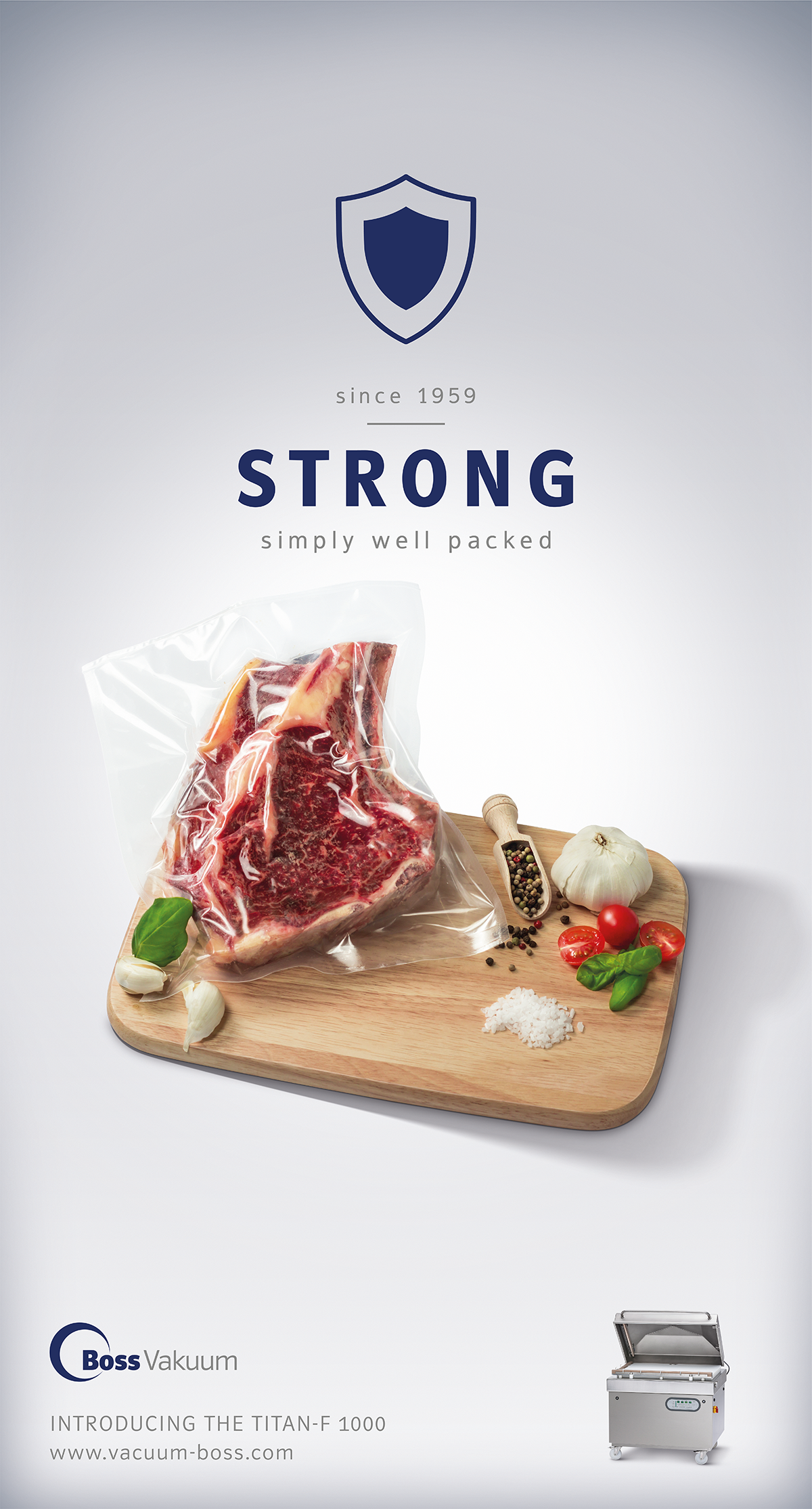 Über 50 Jahre know-how im Vakuum-Verpackungsmaschinen Bereich, zeichnen die Firma Boss Vakuum aus. Die Maschinen überzeugen durch Qualität, Handhabung und Design. Doch wirklich wichtig ist nicht die Maschine, sondern das Endprodukt. Um beides in Einklang zu bringen wurde das Verpackte Endprodukt in Szene gesetzt und unterstützend zu jeder Maschinenserie eine Hauptaussage getroffen, die sich in der Bildkomposition wiederfindet.