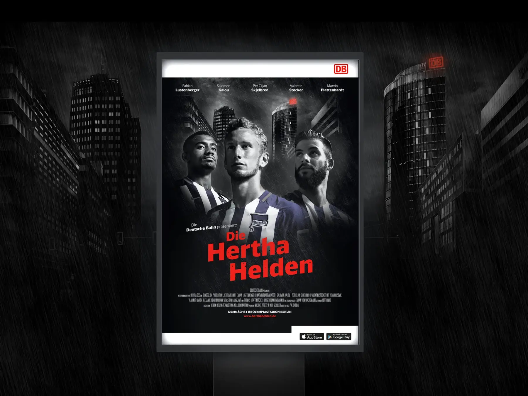 Die Herausforderung im Design: Wie wird aus der Corporate Identity der Deutschen Bahn und den Vereinsfarben der Hertha eine Bühne für Helden? Indem etwas völlig Eigenes entsteht. Der neue Look setzt auf die fast mystische Atmosphäre eines Flutlichtspiels bei Regen und lehnt sich damit an die Bildwelt dunkler Cult-Comics an. Dieser Look spiegelt sich auch in der Darstellung der Spieler – wahre Helden, die auch in der Niederlage alles geben.