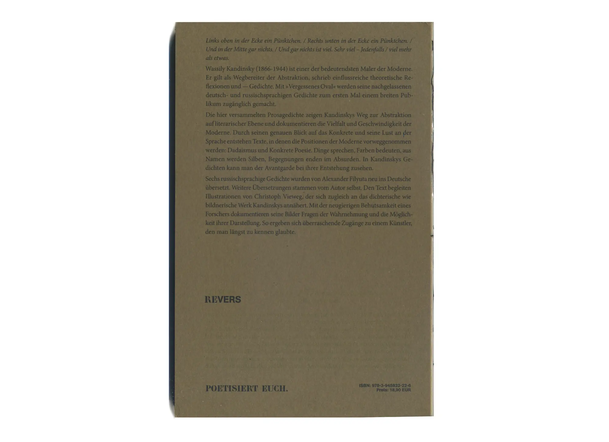 Wassily Kandinsky (1866-1944) ist einer der bedeutendsten Maler der Moderne. Er gilt als Wegbereiter der Abstraktion, schrieb einflussreiche theoretische Reflexionen und — Gedichte. Mit »Vergessenes Oval« werden seine nachgelassenen deutsch- und russischsprachigen Gedichte zum ersten Mal einem breiten Publikum zugänglich gemacht.