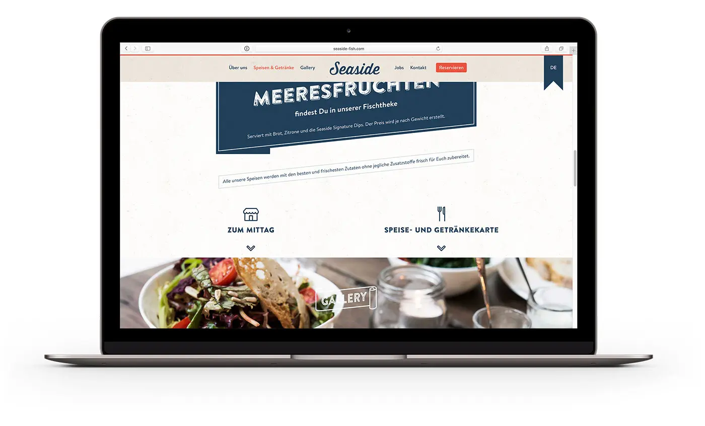 Visuelles Erscheinungsbild für das Fischrestaurant Seaside in Berlin. Ein allumfassendes Brand-Projekt von der Logo-Überarbeitung, über die Fassadenbeschilderung, den gängigen Printmaterialien (Speisekarten, Weinetiketten, Take-Away-Utensilien, Geschäftsausstattung) bis hin zur Website.