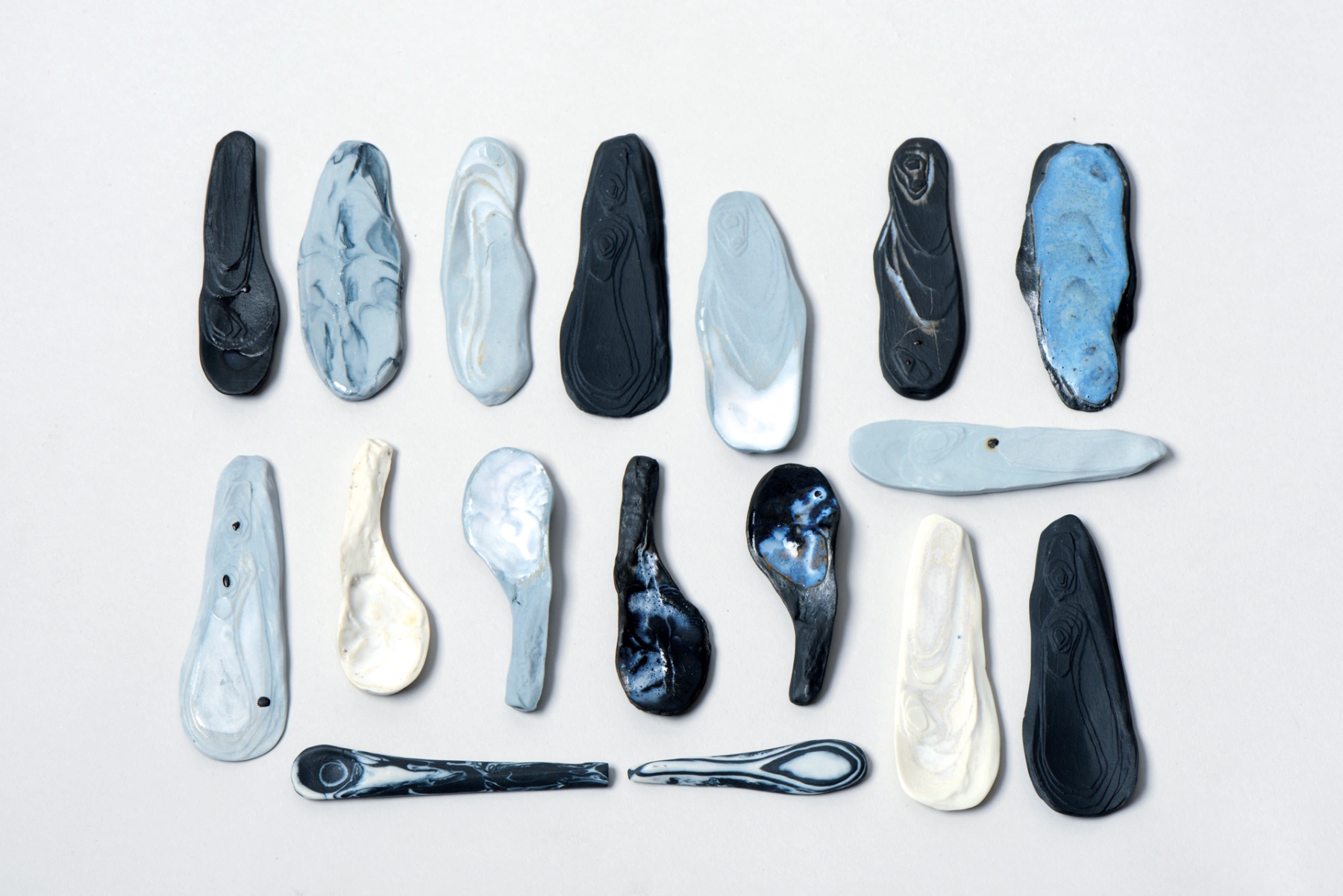 Ein Geschirr zum Servieren von Austern und Kaviar. Raue, glatte, glänzende, matte und sandige Oberflächen nehmen Bezug auf die Herkunft der Speisen. Das Gedeck besteht aus Porzellan und Glas, sowie Servietten und Löffeln zum Portionieren des Kaviars.