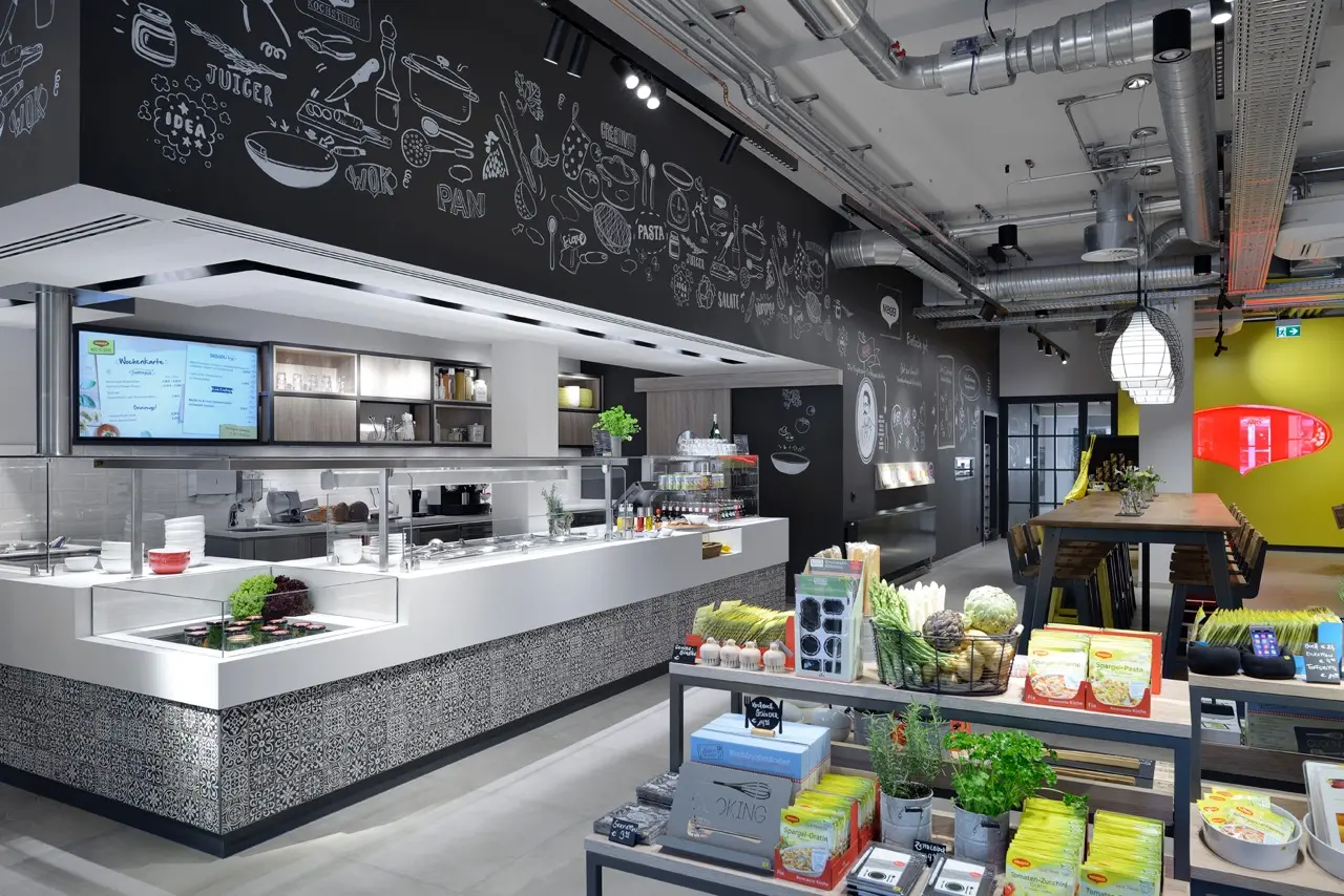 Im Konzept von sbp bleibt das Raumprogramm immer flexibel: wo man tagsüber eine wechselnde Auswahl kleiner Gerichte und frischer Salate genießt, finden abends Veranstaltungen rund um das Thema Kochen und Ernährung oder Firmen-Events statt. Wo man in kleinen Gruppen Kochkurse aller Art bucht, werden auch Film- und Fotoinhalte für die digitalen Medien live produziert. In entspannter Atmosphäre einkaufen und gleichzeitig ein Kaltgetränk oder einen Kaffee genießen…die Nutzung des neuen Maggi Kochstudio Stores ist vielfältig und wandelbar.