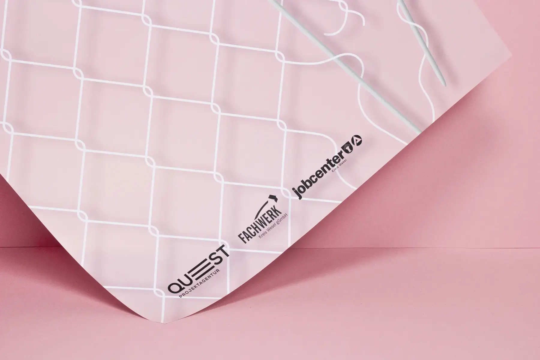 Ein Jahr lang begleiteten wir von Studio KQ das Pilotprojekt »MEgA« als Dozenten für Gestaltung und Medienarbeit. Das Projekt, welches kulturpädagogische Ansätze und Theaterarbeit in den Mittelpunkt stellt, gab uns die Möglichkeit Woche für Woche mit rund dreißig arbeitssuchenden Menschen in unterschiedlichsten Workshops, Impulsen und Interventionen zusammenzuarbeiten und kreative Lösungsansätze zu entwickeln. Neben der reinen Wissensvermittlung ging es dabei hauptsächlich um gemeinsames mediales und ästhetisches spielen, ausprobieren und entdecken. Dabei arbeiteten wir, wie alle Gewerke des Projekts, stets auf die kommende Performance hin. Für die letzte dieser Aufführungen entwarfen wir – neben dem Titel »Grenzwerte« – ein Motiv, welches verbildlicht, dass ein jeder Mensch seine ganz eigenen ideellen Grenzen strickt. Bild- und Farbwahl kontrastieren die Thematik dabei mit ihrer Unschuld und Naivität.