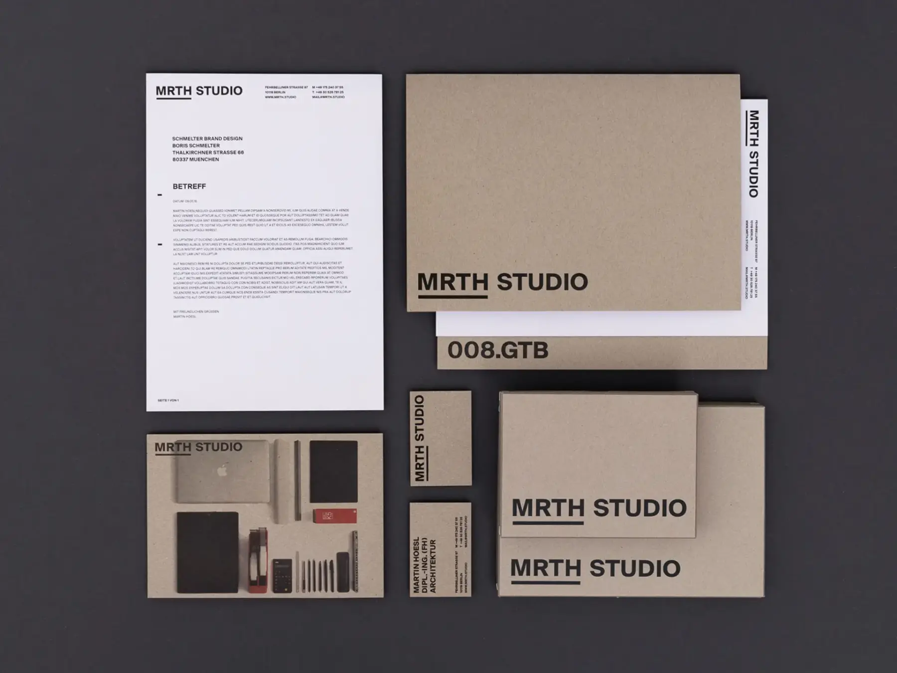 Die Markenwerte werden vor allem durch eine klare Typografie und die starke – in schwarz gehaltene – Wortmarke transportiert. Durch die Kombination dieser Elemente mit Graupappe als Basismaterial für die Geschäftsausstattung wird eine hohe Ästhetik erreicht, die sowohl das Spiel mit Materialen als auch den funktionalen Charakter verkörpert. Neben Visiten- und Postkarten erhalten auch Ordner und Deckblätter einen starken Wiedererkennungswert und bewahren gleichzeitig die Neutralität, um unterschiedliche Architektur-Entwürfe nicht zu stören.
