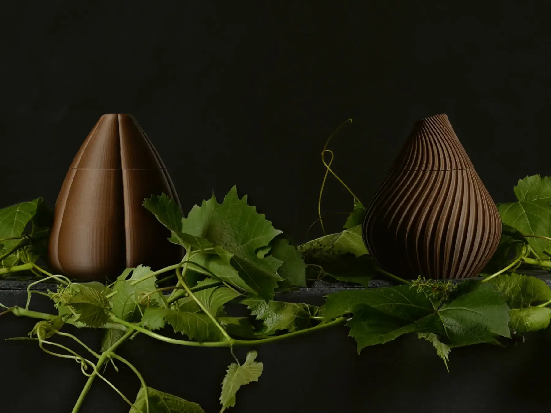 Trester-Biokunststoff-Kompound: Der 3D-Druck ist ein materialsparendes Herstellungsverfahren; es fallen keine Abfälle an. Jedoch wird in der Regel mit Plastik gedruckt. Trester ist eine Alternative. In Verbindung mit Biokunststoff auf Zellulosebasis konnte (durch eine Kooperation mit dem IKV Aachen) ein Granulat kompoundiert werden, dessen Druckfähigkeit derzeit getestet wird. Prototypisch wurden Formen für Urnen entwickelt, deren Gestaltung abstrahierte Formen der unterschiedlichen Wachstumsstadien der Traube versinnbildlicht.