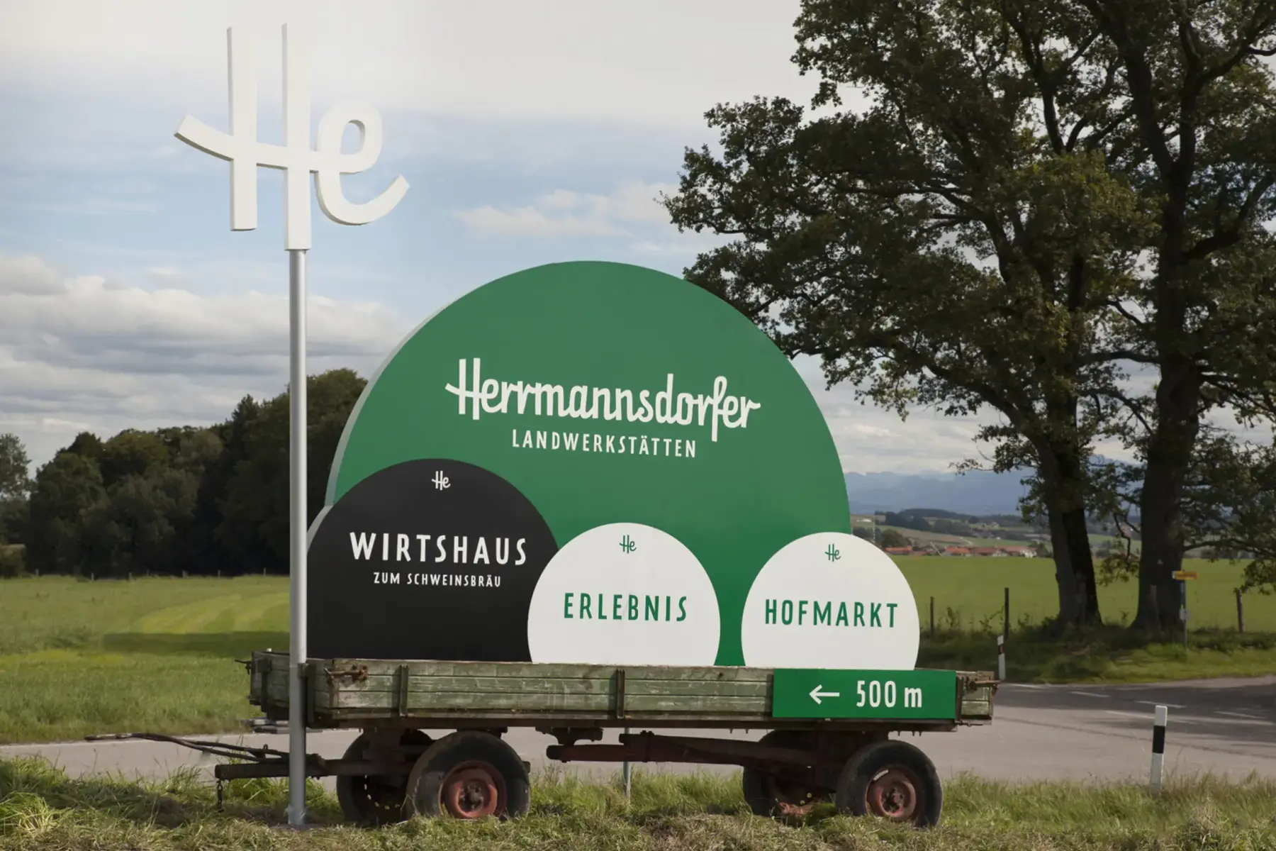 Seit über 30 Jahren stehen die Herrmannsdorfer Landwerkstätten für ökologische Landwirtschaft, artgerechte Tierhaltung und wahrhaft gute Lebensmittel. Und seit jeher wird diese Haltung am deutlichsten direkt an der Quelle spürbar: dem Familiengut in Glonn. Als Dreh- und Angelpunkt der Marke und als Ort, an dem alle Aspekte der Marke erlebbar werden und Berührungspunkte für Kunden und Besucher bieten, erfindet sich das Gut jetzt neu – als „Herrmannsdorfer Erlebnis“. Ein eigens für das Gelände entwickeltes Leitsystem spielt dabei eine wesentliche Rolle beim schöneren Entdecken und besseren Verstehen: Von der Tierhaltung über die vor Ort Produktion und die Kurse, in denen Besucher das Brezn-Drehen und Wursten lernen können. Bis zu den Führungen durch die eigene Bäckerei und Brauerei oder die Einkehr ins Wirtshaus.