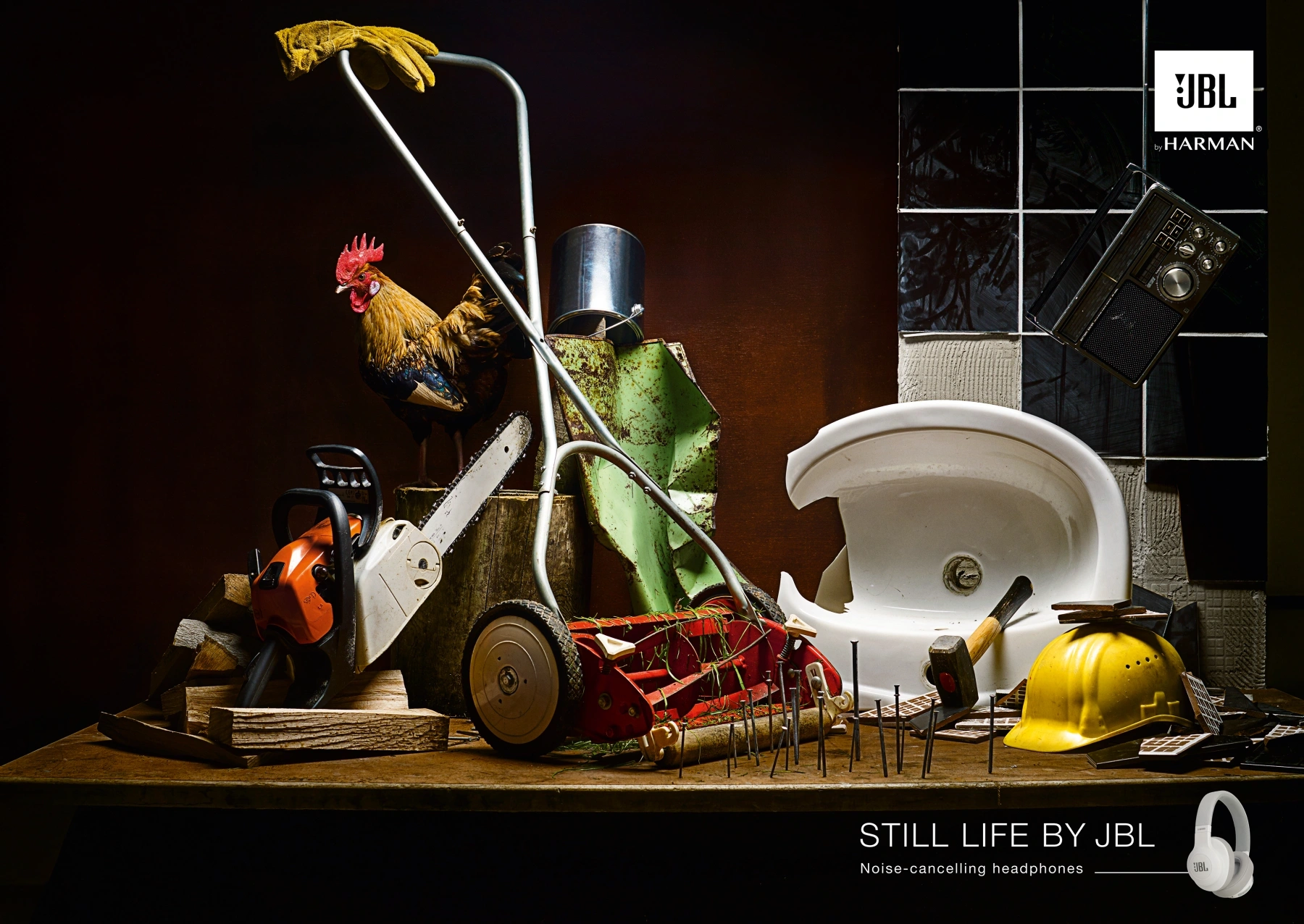 To address an urban target group, interested in music, art and culture, but stressed by the noise level of a busy city environment, we created a piece of advertising that doesn’t look like advertising but like a piece of art. Our three motifs “garden”, “kids” and “household” were designed to match typical sources of noise in our urban audience’s everyday life. With our still life look we created an even bigger impact, communicating the product benefit and the high quality of JBL’s noise-cancelling headphones through real-life sources of noise, turned into still life art.