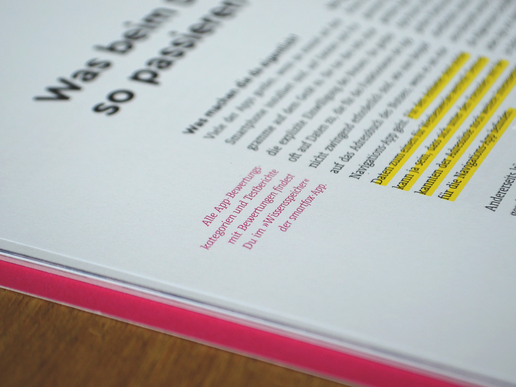 Dem gestalterischen Konzept von Smartfox liegen leuchtende, motivierende Farben zugrunde, die bewusst im Kontrast zum Weißraum des Layouts stehen. Die Aufmacherseiten und Zusammenfassungen eines jeden Kapitels stechen mit plakativen Farbverläufen heraus, sodass man sich im Zusammenspiel mit der Navigation auf jeder Seite einfach orientieren kann.
