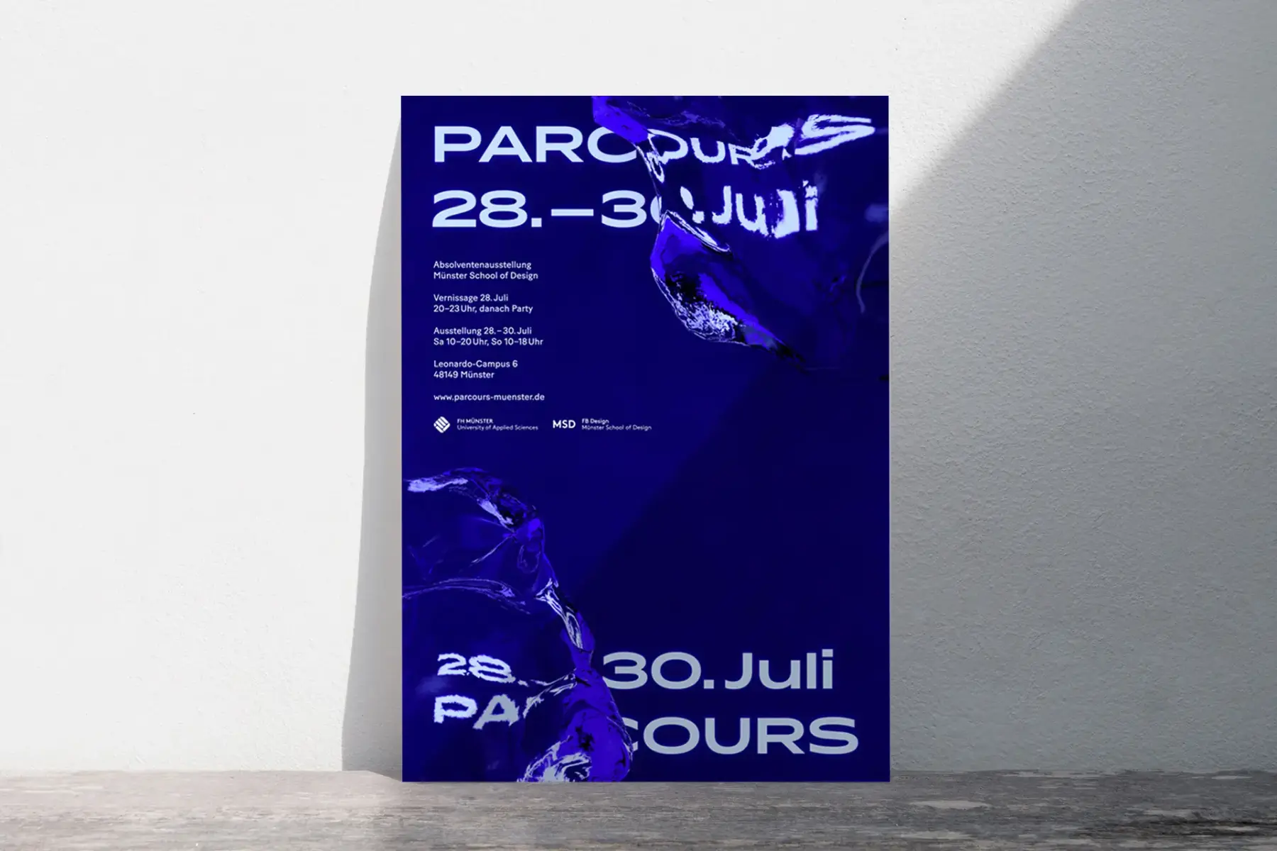 Design als Vermittler von Inhalten, Themen hinterfragen und niemals langweilig sein. Parcours lässt etwas finden an das wir glauben, etwas anderes als Mode, Stil, Dekorationen und Schmetterlinge. Parcours begrüßt das Unvollständige, macht Fehler, macht den Computer aus und lässt Nein nicht als Antwort gelten. Hier soll Design aufregend, hinterfragend, zeitgemäß und relevant sein. Erarbeitet wird die gesamte Bandbreite einer zeitgemäßen Eventkommunikation. Ausgehend vom Ausstellungsdesign, analoger und digitaler Katalog, Teaser der Ausstellung, Absolventenporträts im Bewegtbild, Einladungen, Plakate bis hin zur kommunikativen Begleitung über social Media.
