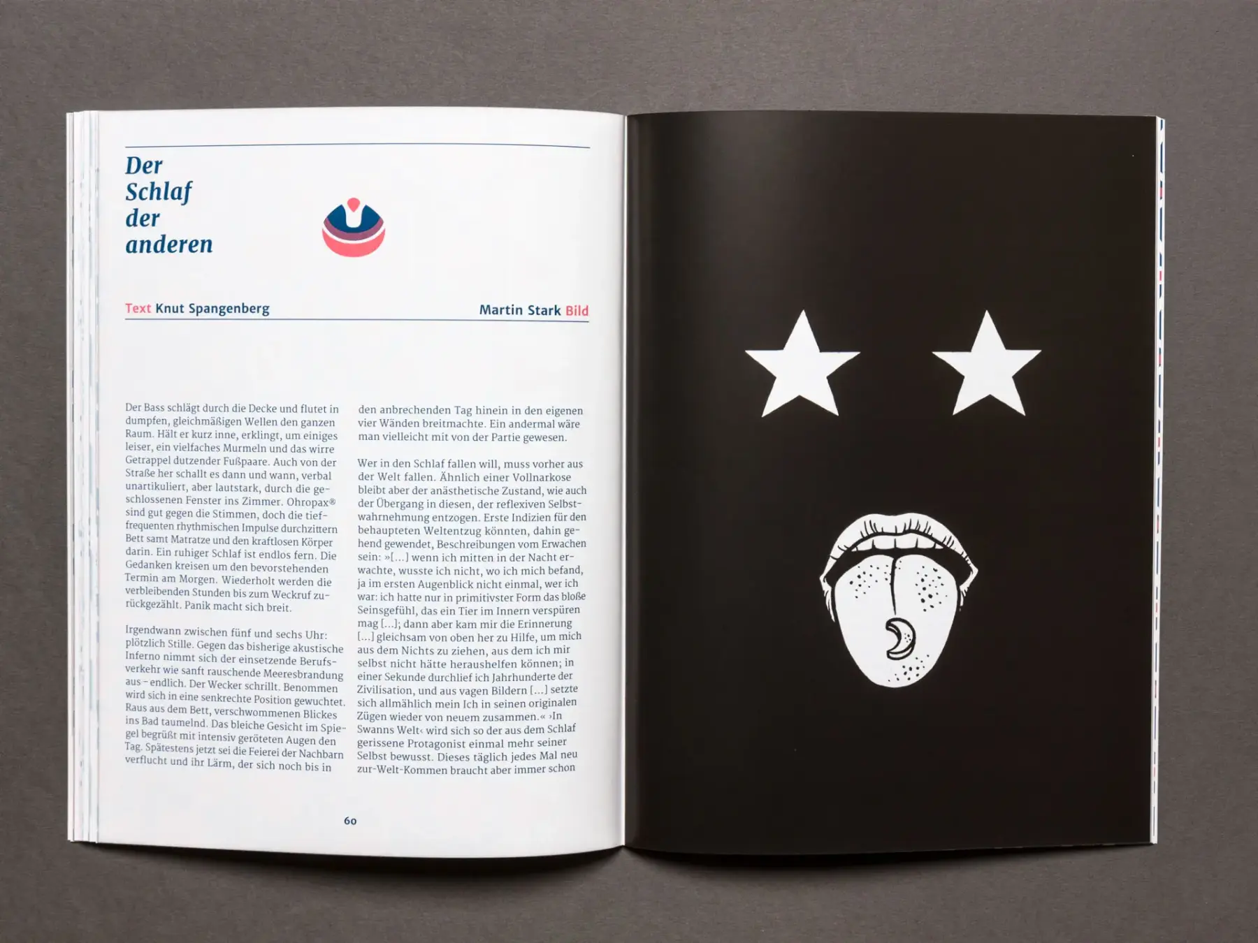 In dieser Publikation gewähren jeweils 19 junge Autoren und Illustratoren Einblick in ihre Gedanken zum Thema Schlaf. Gleichwertig positioniert bilden Text und Bild in ihren unterschiedlichen Formen eine ehrliche, kritische und unterhaltsame Lektüre. Die Gestaltung des Hefts unterstreicht dieses Gleichgewicht und wurde von Motels der 50er und 60er Jahre inspiriert.