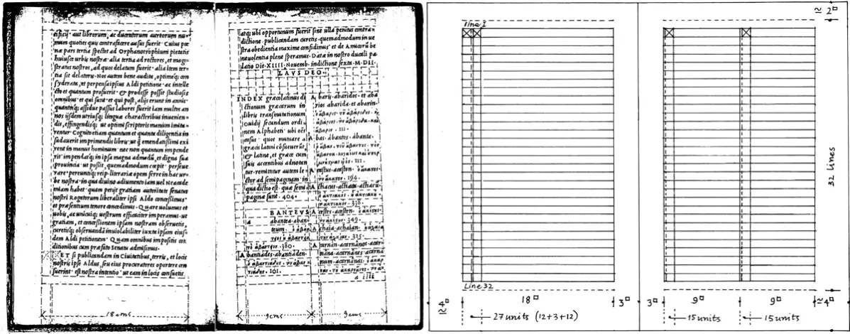 Das Raster der Zeichen des Yì Jīng ist einfach. Ein wesentlich komplexeres Raster können wir in der Arbeit von Aldus Pius Manutius (1449–1515) finden. Peter Burnhill untersuchte in seinem Buch Type spaces: in-house norms in the typography of Aldus Manutius 4 die typografischen Normen Aldus Manutius’ und konnte komplexe Raster entdecken, die auf eine enge Zusammenarbeit mit Francesco Griffo, seinem Stempelschneider schließen ließen. Die Normen des Aldus Manutius sind zeitgenössischen Rastersystemen in vielen Dingen ähnlich, so zum Beispiel die modulare Abmessung von Positiv- und Negativraum.