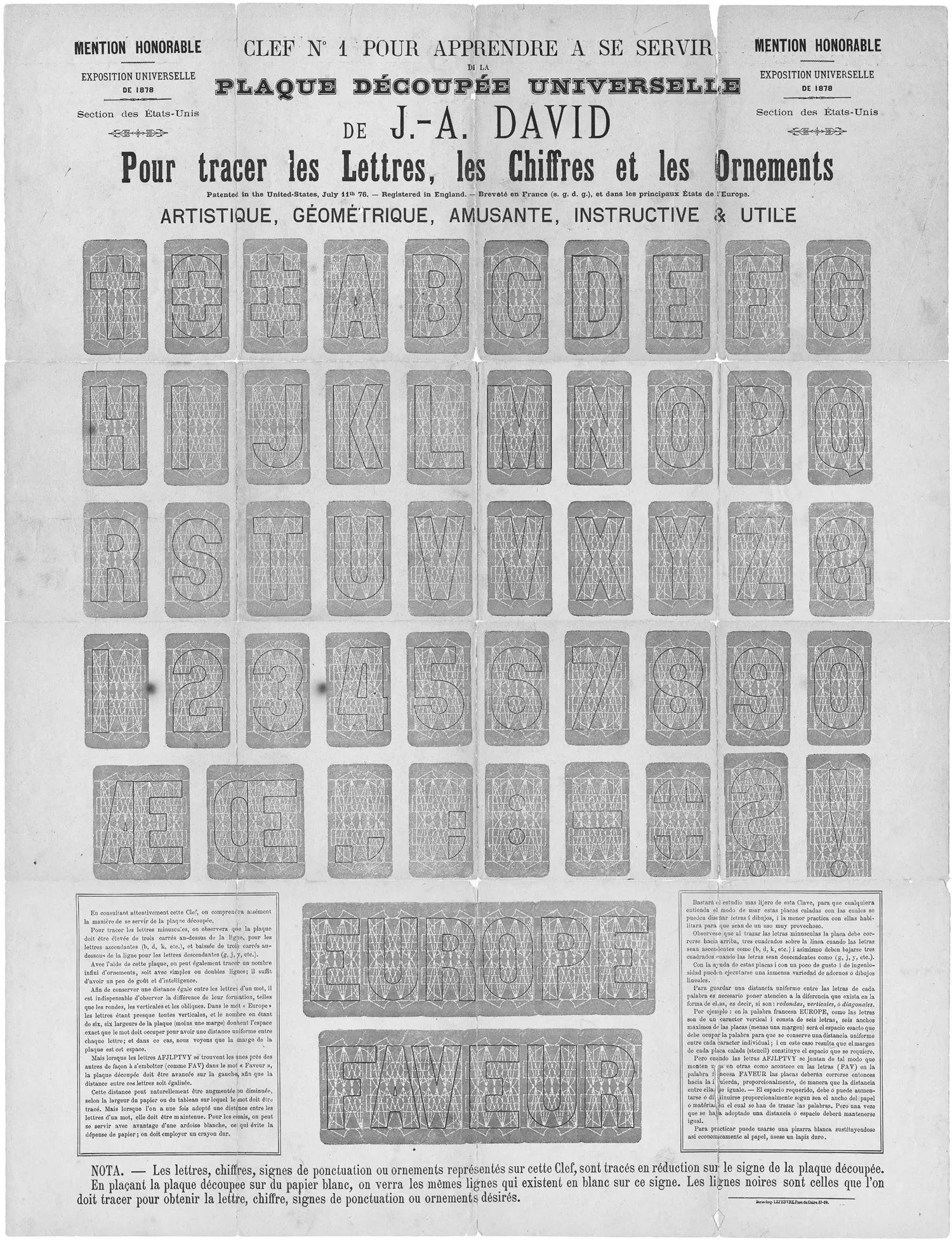 Laut Erik Kindel patentierte im Jahr 1876 Joseph A. David ein Schablonen-System für Schildermaler, die Plaque Découpée Universelle. 13 Mit dieser Universal-Schablone war man in der Lage alle Klein- und Großbuchstaben, sowie die Nummern, die Interpunktion und alle Akzente zu zeichnen. Zwar musste man zuerst lernen, sich in dem komplexen Raster der Plaque Découpée Universelle zurechtzufinden, man hatte aber dafür den Vorteil, nur eine verhältnismäßig kleine Schablone zu benötigen.