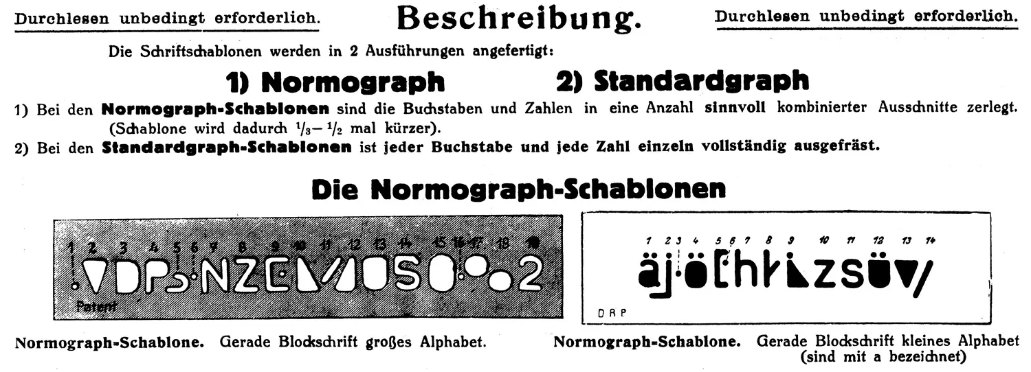 Im ersten Jahrzehnt des 20. Jahrhundert, so Albert-Jan Pool, entwickelte Georg Bahr, Berufsschullehrer aus Charlottenburg/Berlin, ein neues Beschriftungswerkzeug. Es hatte die Form und Größe eines Lineals und kam mit einem passenden Stift. Der Benutzer musste das Lineal bewegen, um komplette Buchstaben zeichnen zu können. Es dauerte eine Weile, um ein ganzes Wort zu schreiben, die Schablone war aber dafür handlich und kostengünstig. Laut Pool patentierte Bahr das „Kurvenlineal zum Aufzeichnen von Schriftzeichen“ im Jahr 1909. Ein Jahr später verkaufte er es allerdings schon wieder an seine Freunde Paul Filler und Oscar Fiebig. Filler und Fiebig gründeten eine Firma, die den „Bahr’schen Normographen“ produzierte und verkaufte. Der zu einem späteren Zeitpunkt entwickelte „Standardgraph“ war eine Schablone mit einem kompletten, ausgezeichneten Alphabet. Der Standardgraph wurde so erfolgreich, dass Filler und Fiebig die Firma 1967 in Standardgraph Filler & Fiebig GmbH umbenannten. Bis heute produziert die Firma ein großes Sortiment an Schablonen, hauptsächlich für technische Zeichnungen.
