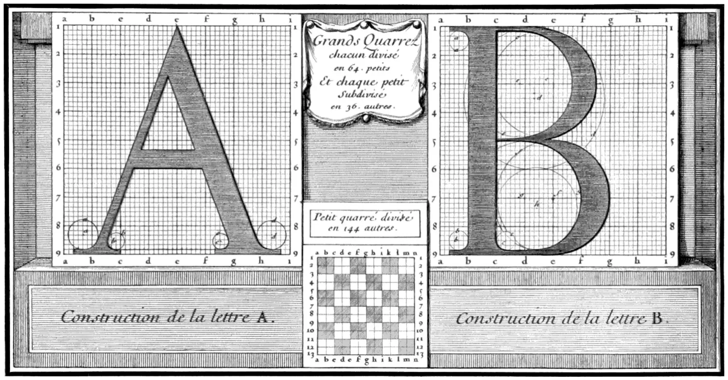 8 Fred Smeijers schreibt in seinem Buch „Counterpunch“ von 1996, „… Schrift, die mit Hilfe von Lineal und Kompass auf einem Raster konstruiert wurde, kann nur dann funktionieren, wenn sie von dem Designer ausgeführt wird, der sie auch entworfen hat und das Raster benutzt hat, um schneller zu arbeiten, nicht um sie rationaler und angeblich besser zu machen.“ Smeijers verwies damit auf die unmögliche Aufgabe, sehr kleine Buchstaben aus Stahl zu schneiden, die auf einem sehr feinen Raster entworfen worden sind, wie die Romain du Roi.
