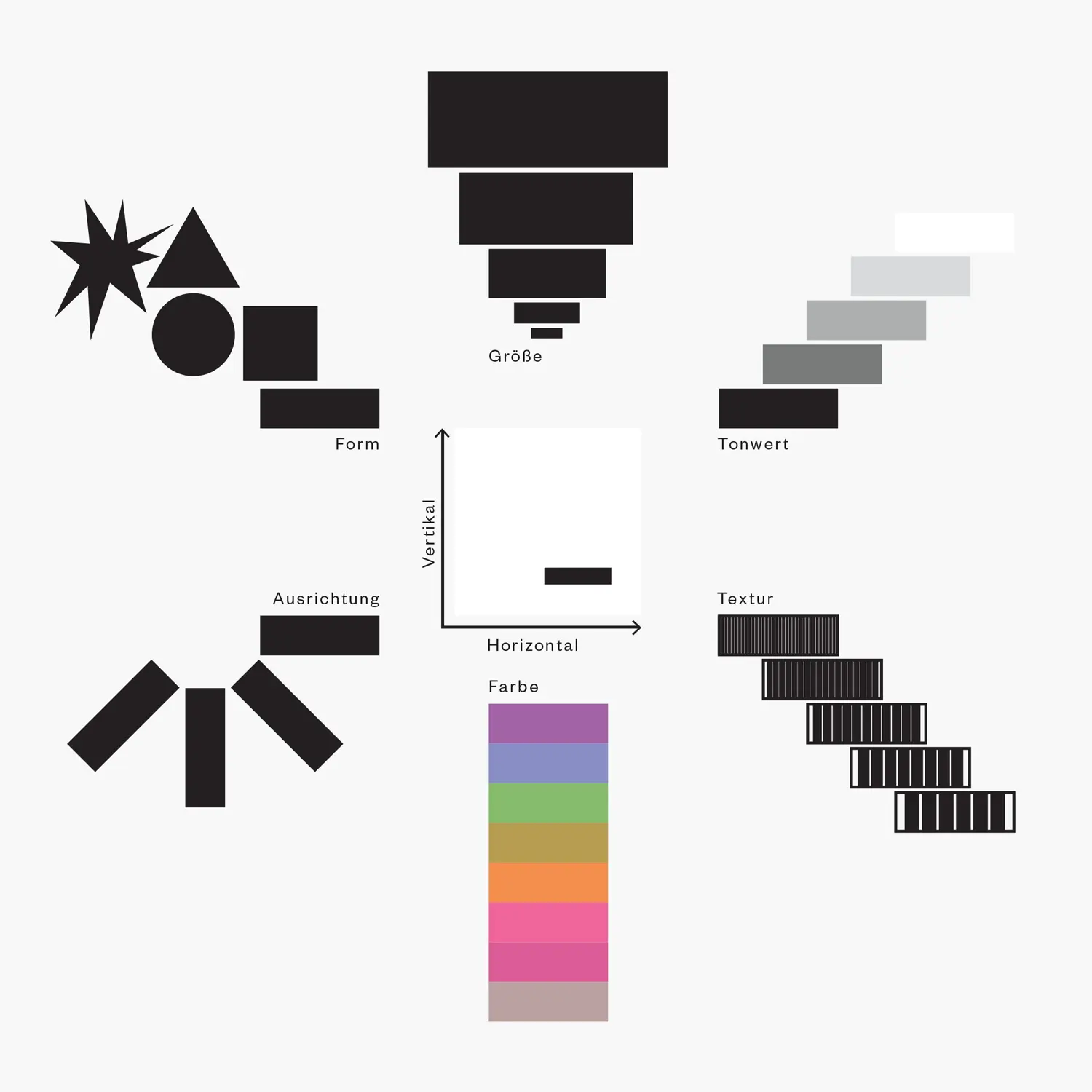 Bertins grafisches System hat acht visuelle Variablen. Die vertikale und die horizontale Position des Elements auf der Oberfläche, sowie die Größe, der Tonwert, die Textur, 8 die Farbe, die Ausrichtung und die Form des Elements.