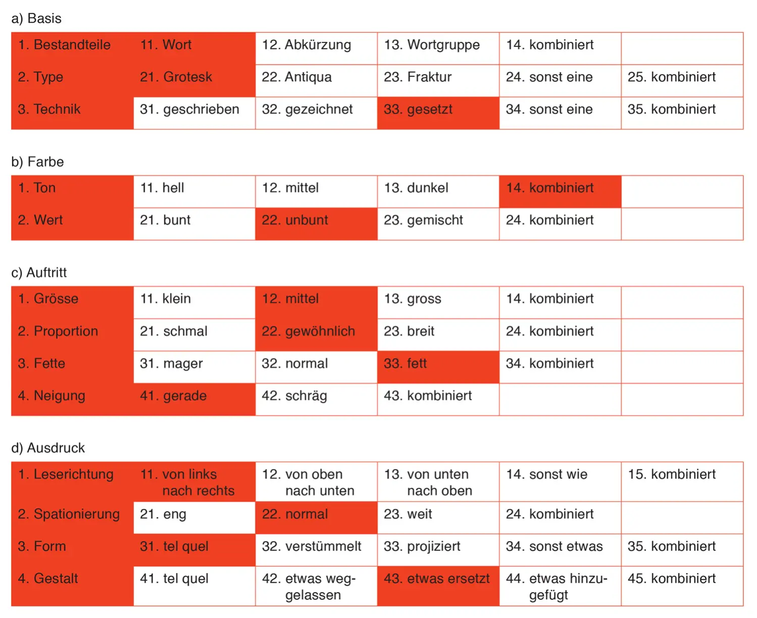 Kehren wir zu Gerstner und den flexiblen Systemen in der Typografie zurück. In seinen Büchern Programme gestalten und Kompendium für Alphabeten 2 spielte Gerstner mit Fritz Zwicky’s morphologischem Kasten. Gerstner versuchte alle möglichen Aspekte einer Wortmarke aufzulisten. Er unterteilte die Aspekte in die vier Hauptbereiche: „Basis“, „Farbe“, „Auftritt“ und „Ausdruck“. Jeder dieser Bereiche wurde wiederum unterteilt und mit verschiedenen Eigenschaften belegt. Durch die Wahl jeweils einer Eigenschaft aus einem Bereich entstanden verschiedene Kombinationen. Gerstner schreibt in Kompendium für Alphabeten, dass der morphologische Kasten genutzt werden kann, um zufällige Lösungen zu schaffen oder einen Überblick zu bekommen, welche Möglichkeiten der Gestalter bei der Gestaltung einer Wortmarke hat.