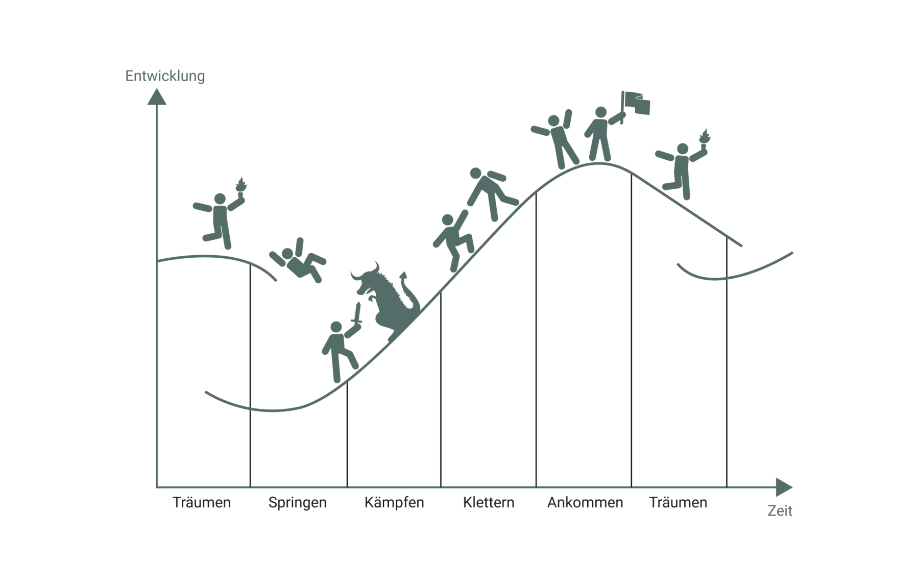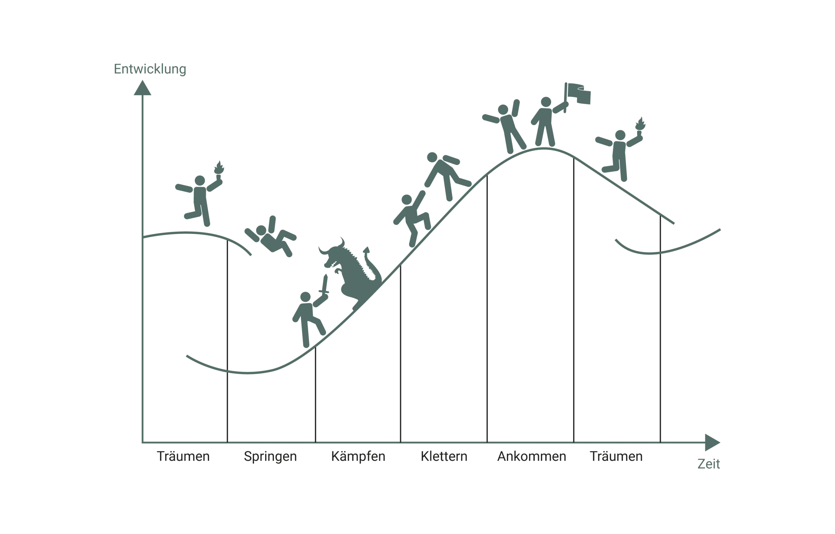 Grafik: Die narrative Struktur von Change-Prozessen, nach Nancy Duarte und Patti Sanchez: Illuminate. Ignite change through speeches, stories, ceremonies, and symbols. Great Britain: 2016. S. 11 und S. 14.