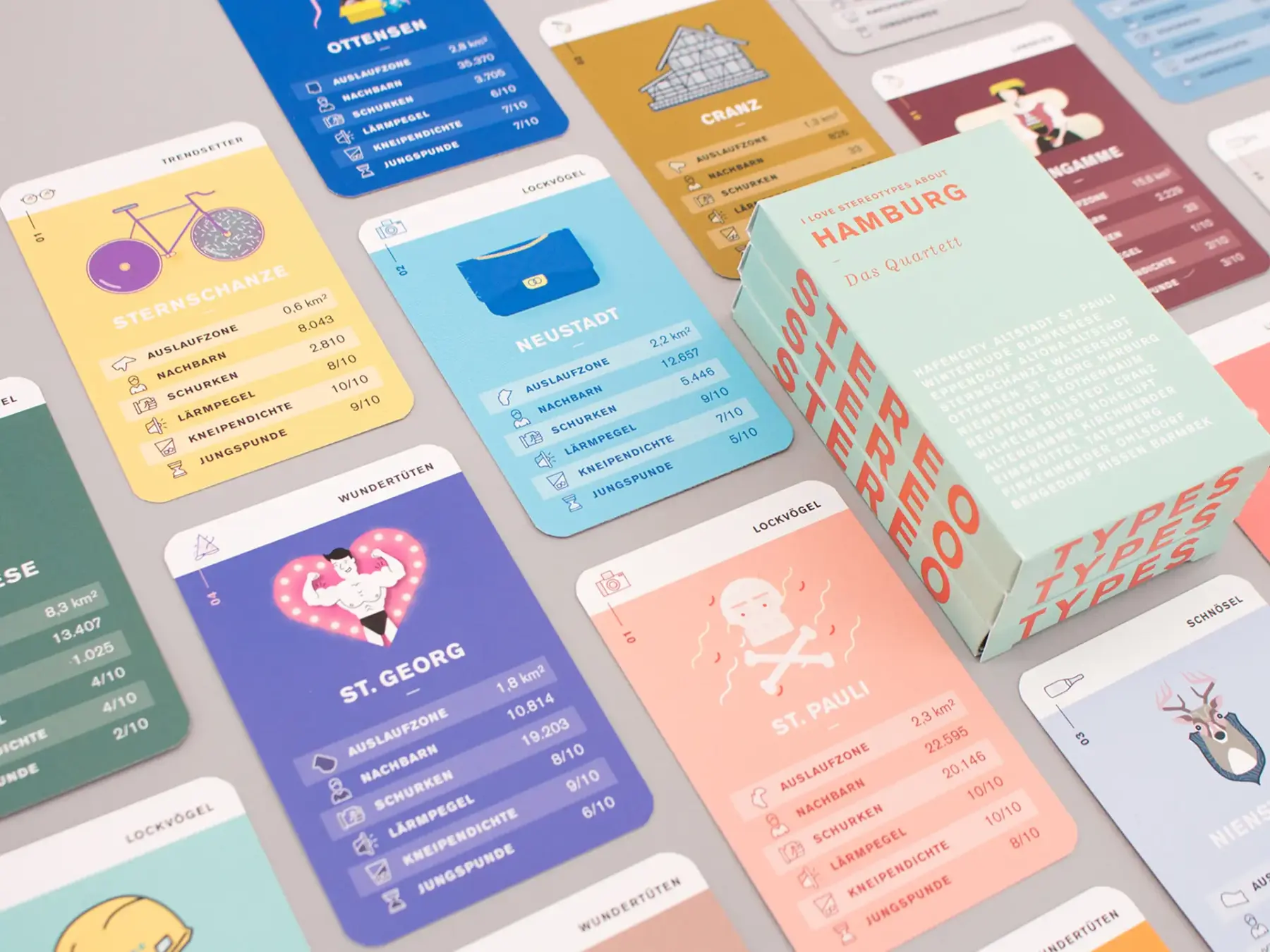 Jetzt bringt Bureau Bald eure Lieblings-Kieze auch im Mini-Format als Spielquartett auf die Hand. Gehört euer Stadtteil zu den Schnöseln oder den Lockvögeln oder seid ihr stilbewusste Trendsetter? 28 Hamburger Stadtteile wurden ausgewählt und genauestens unter die Lupe genommen. Wo gibt es die meisten Schurken? Oder wo findet man in der Hansestadt seine Ruhe?