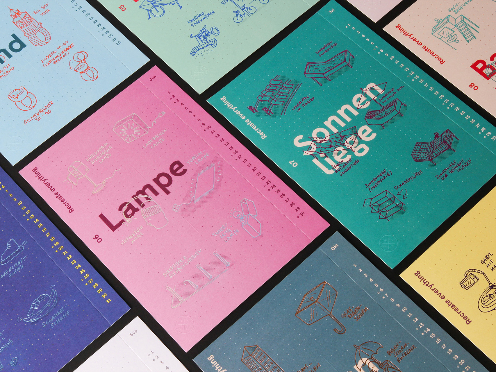 Getreu dem Motto „Recreate everything“ kann der Kalender entweder in seiner ursprünglichen Form mit Kalendarium genutzt werden oder ohne als Postkarten verschickt werden.