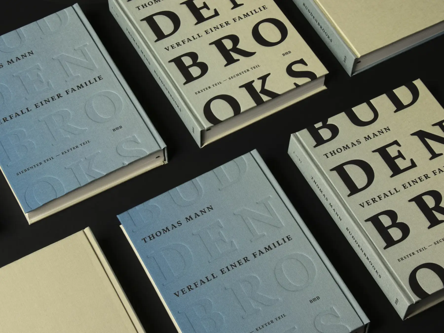 Der Roman „Buddenbrooks“ von Thomas Mann erschien erstmalig 1901 und handelt von dem Verfall einer Lübecker Kaufmannsfamilie. Im Rahmen meiner Bachelorarbeit entwickelte ich eine Neugestaltung des Werks. Die zweibändige Ausgabe greift den Verfall als Kernthema visuell in Form eines Verlaufes auf, der ebenso für den Zusammenhalt der Bände sorgt. Die Blindprägung des zweiten Covers weist auf das Auflösen der Familie Buddenbrook hin. Schrift und Farbwahl unterstützen das feine, aber kühle Sprachempfinden im Roman, während die klassische Innengestaltung eine gute Lesbarkeit ermöglicht.