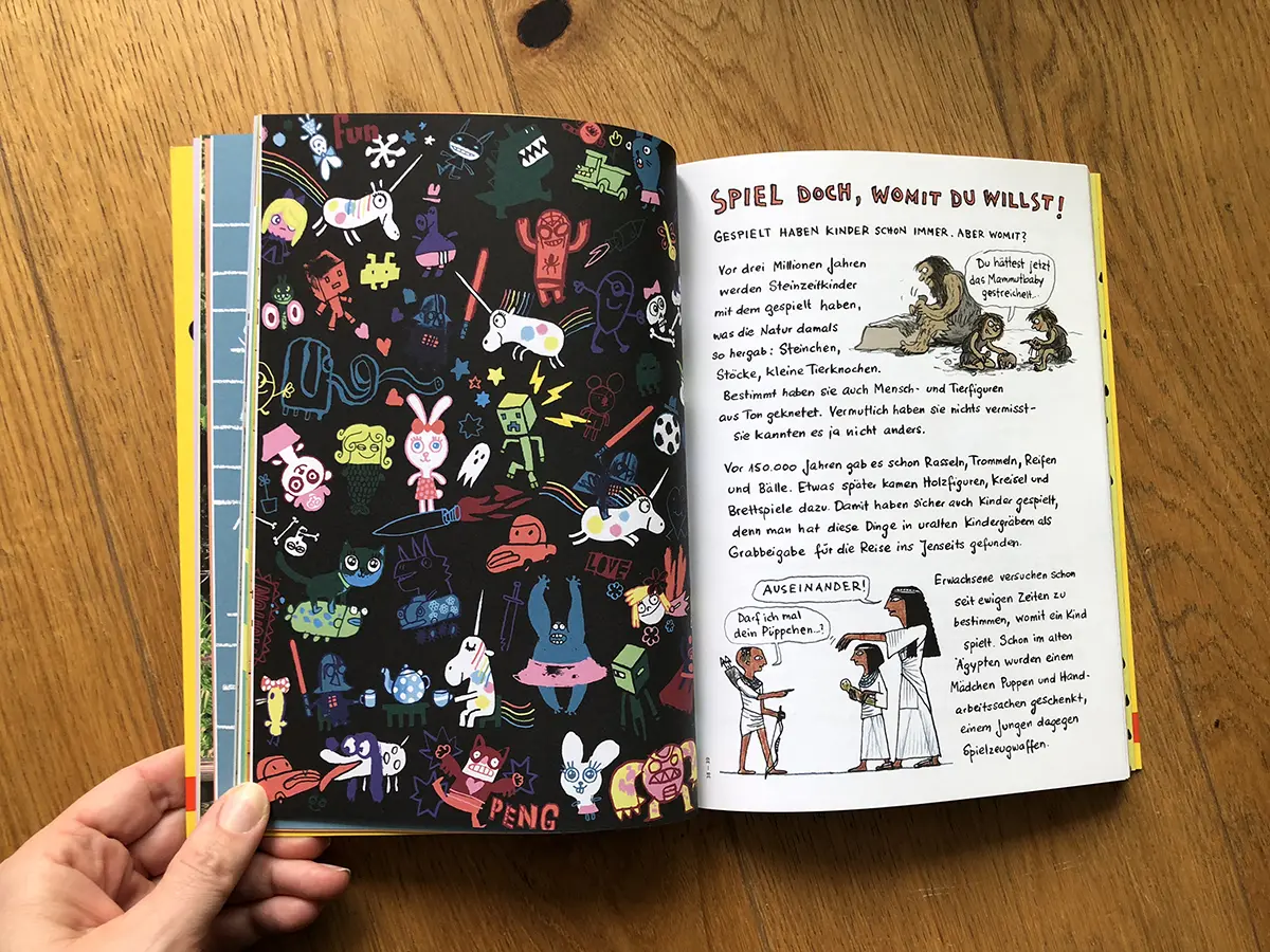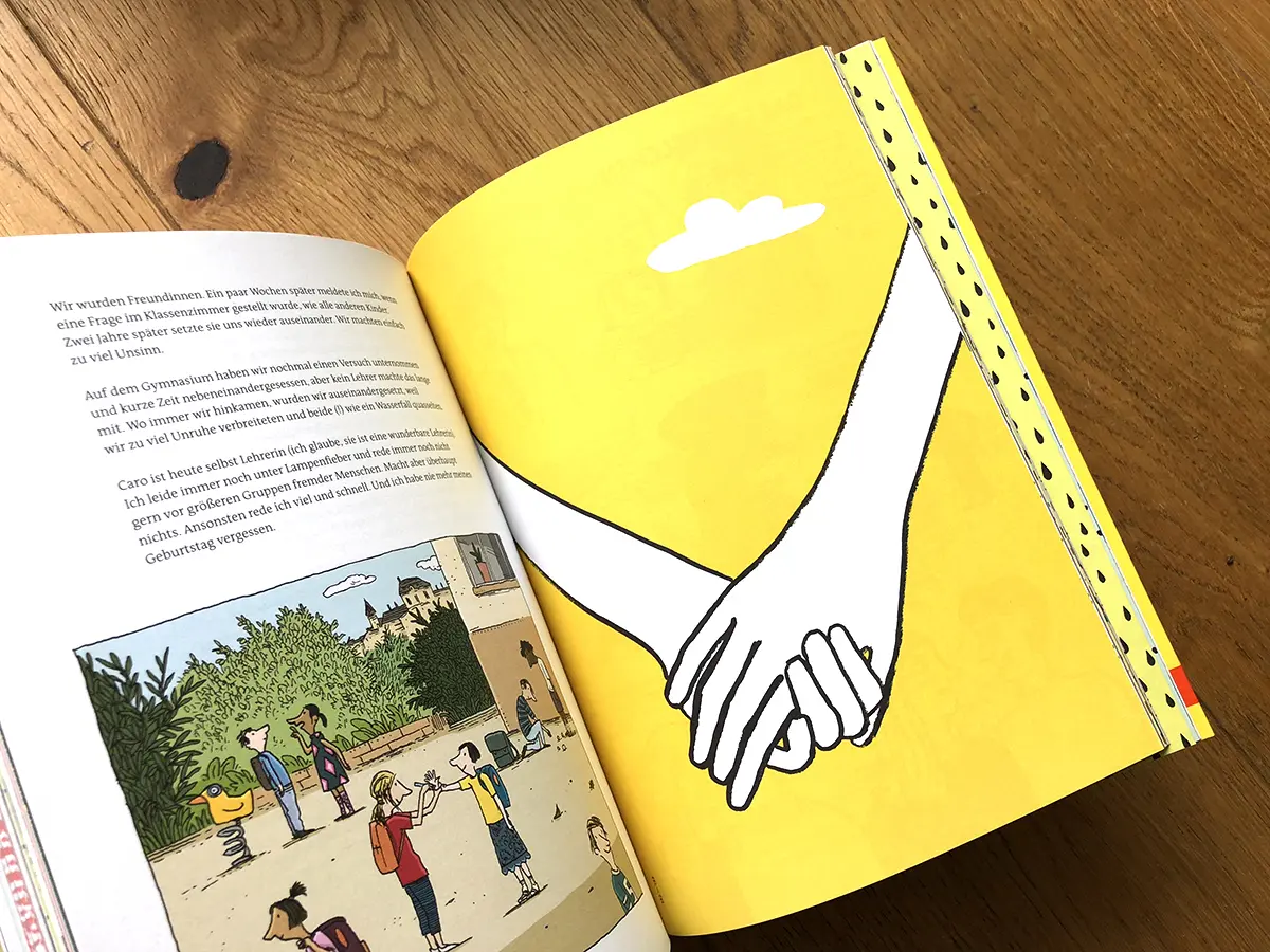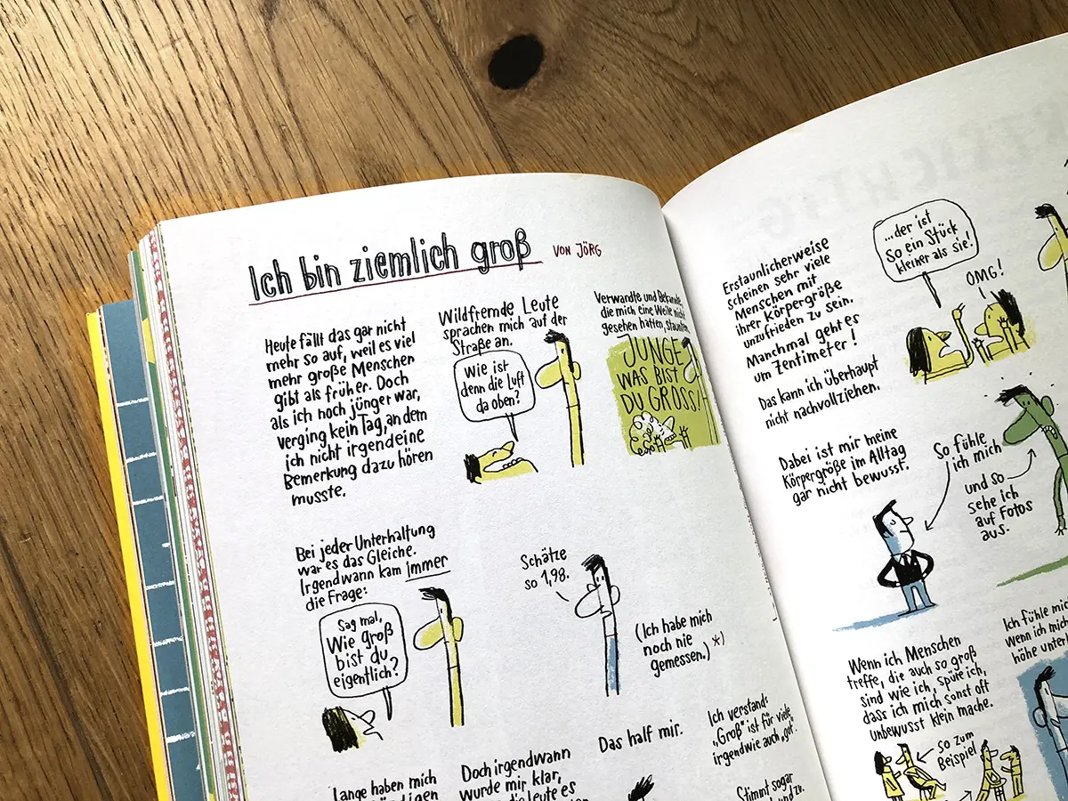 »Ich so du so« ist mir zunächst wegen der Illustrationen aufgefallen. Es ist voller Comics, Zeichnungen, Fotos und Geschichten, die alle grafisch hervorragend aufbereitet und illustriert sind. Besonders die Illustrationen von Philip Waechter haben es mir angetan, aber jede Seite ist einfach wunderbar gestaltet. Man kann als Illustrator dort viele visuelle Anregungen mitnehmen, insofern ist es auch für Erwachsene geeignet.