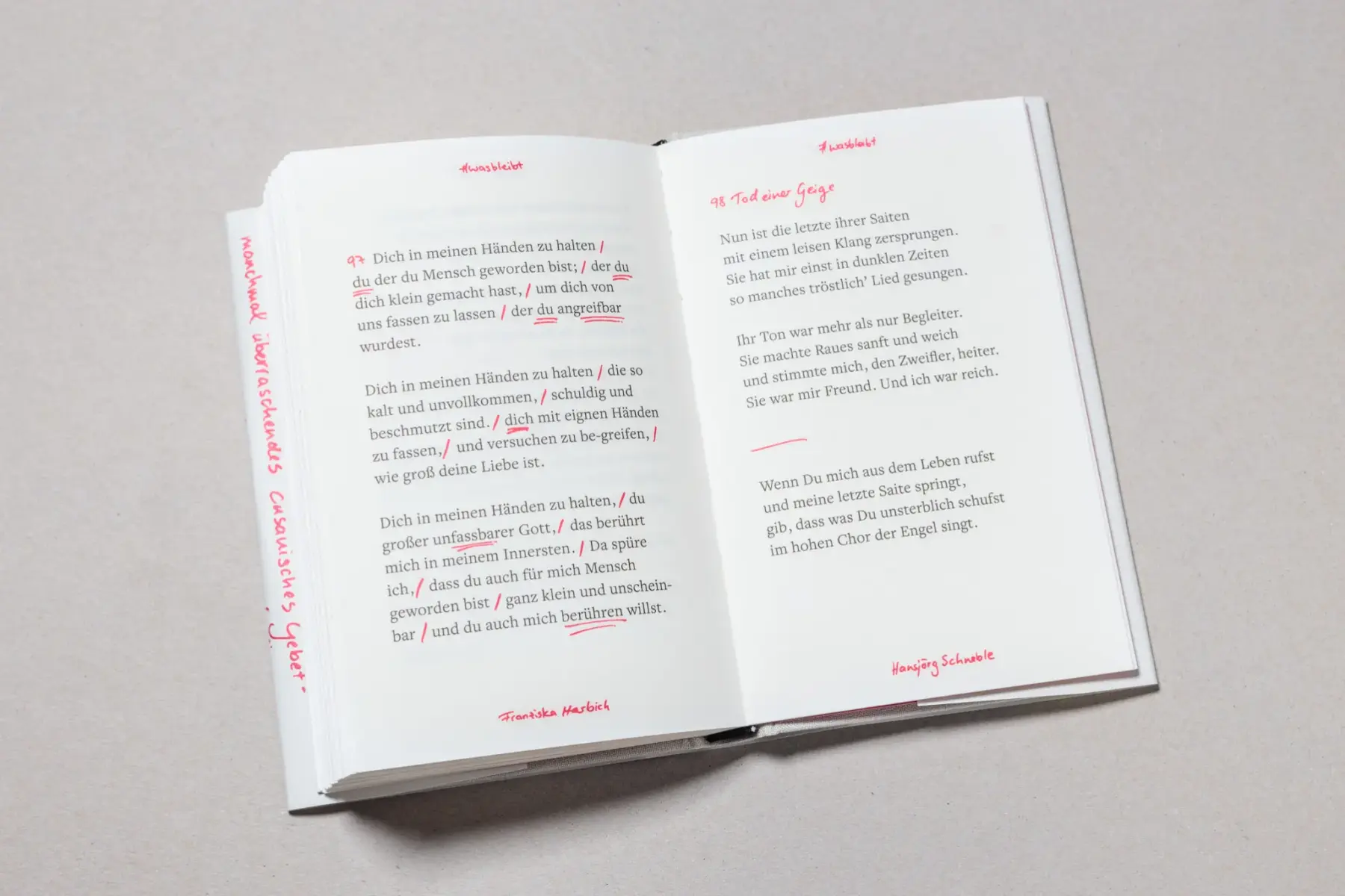 Die Gebete sind auf jeder Doppelseite individuell und angemessen inszeniert. Die Namen der Autoren und Paten in der Fußzeile sorgen dafür, dass die Gebete so persönlich wirken, wie sie gedacht sind. Das Besondere aber ist: Schlagwörter, Namen, Nummern, Anmerkungen und Schrägstriche sind von Hand geschrieben – Seite für Seite. Dabei lassen leere Seiten immer wieder Raum für eigene Texte und Gedanken. Und so wird jedes Buch im Gebrauch zu einem Unikat.
