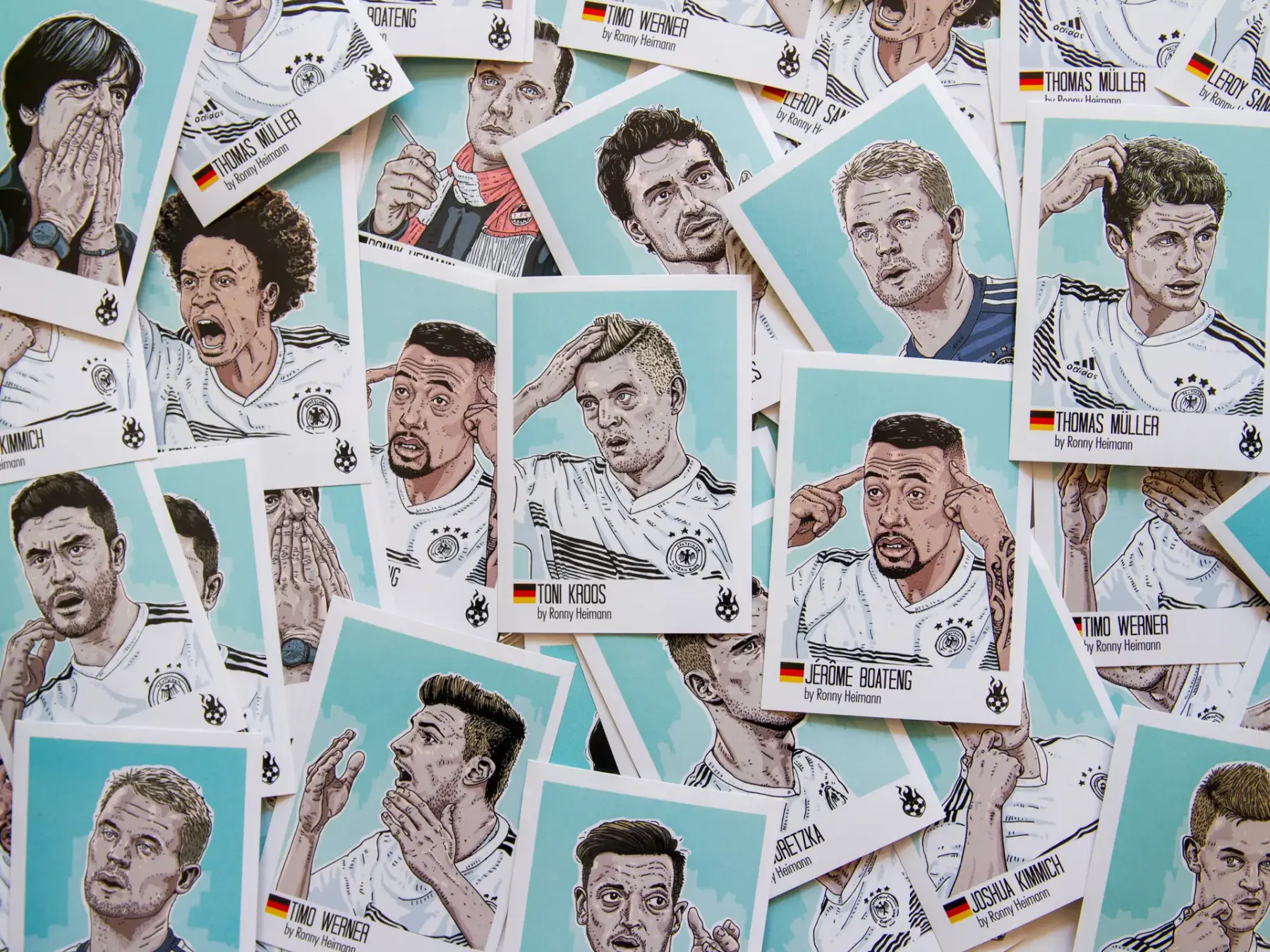 Eine international besetzte Jury wählte die besten Illustrationen aus über 500 Einsendungen aus und teilte den Gewinnern jeweils eine von 32 WM-Mannschaften zu. In diesem Fall: „Die Mannschaft“. Der Mannschaftsgedanke wird in den Illustrationen hervorgehoben. Deshalb guckt keiner der Spieler direkt in die Kamera, so wie man es von den Panini-Bildern kennt. Sie kommunizieren untereinander, nehmen Blickkontakt auf, gestikulieren oder schreien sich an.