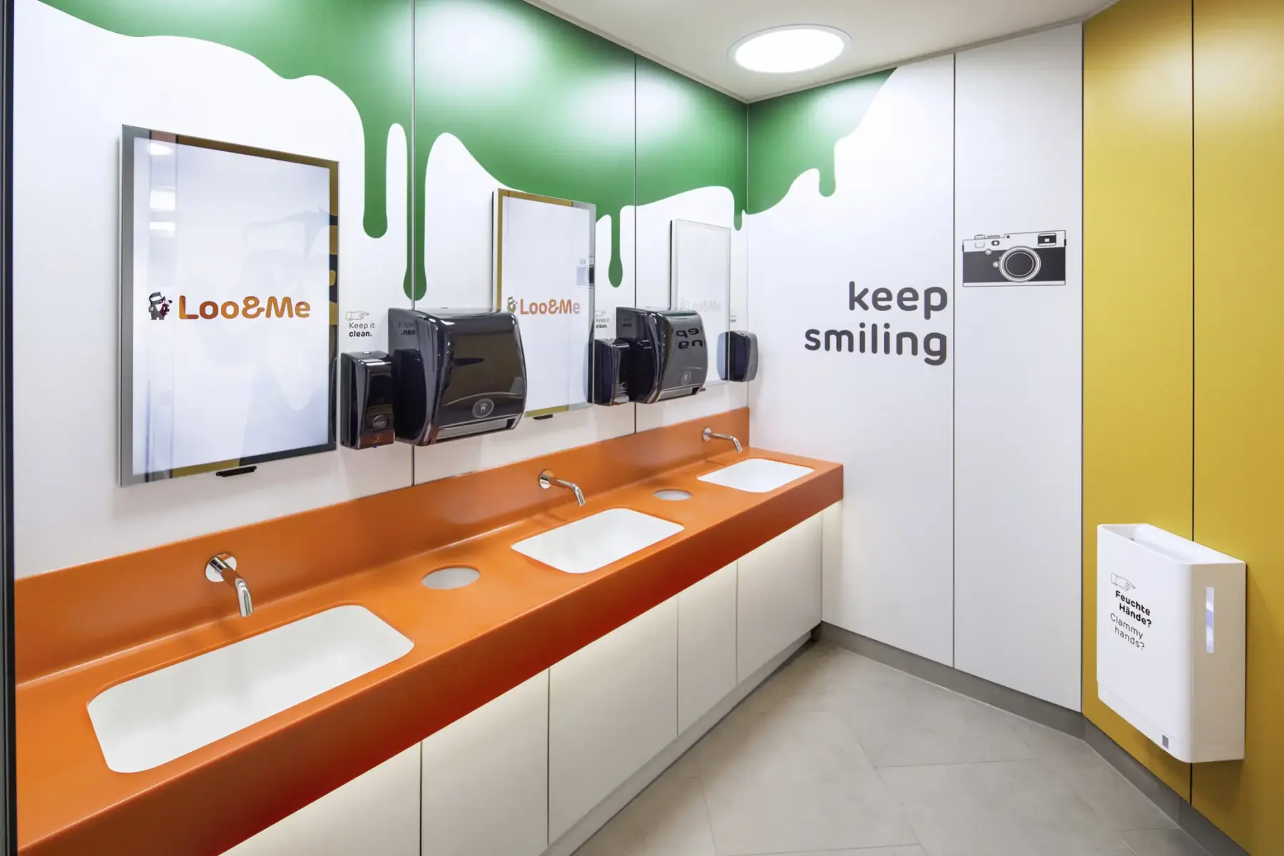 Farbenfrohe Eyecatcher wechseln sich mit abwechslungsreichen, kraftvollen, grafischen Elementen ab. Ein fast schon comic-haft anmutender Look lässt den Betrachter in der Sanitäranlage öfters schmunzeln. Freche Sprüche, wie „Lass krachen“, „Never too late to Rock’n’Roll“ und „Men at Work“, erinnern an typische Klo-Kritzeleien. Das alles sorgt für eine rundum moderne Wohlfühlatmosphäre, die den Kunden auch noch ein Lächeln entlockt. Das moderne Konzept beinhaltet vor allem räumlich durchdachte Details: So gibt es praktische Ablageflächen im Urinalbereich sowie einen lounge-artigen Wartebereich mit USB-Anschlüssen zum Laden von Smartphones. Hinzu kommen Beauty-Stationen und digitale Spiegel mit informativen sowie unterhaltsamen Inhalten. Außerdem sind die liebevoll gestalteten Outfits der Mitarbeiter mit persönlichen Namens-Buttons versehen.