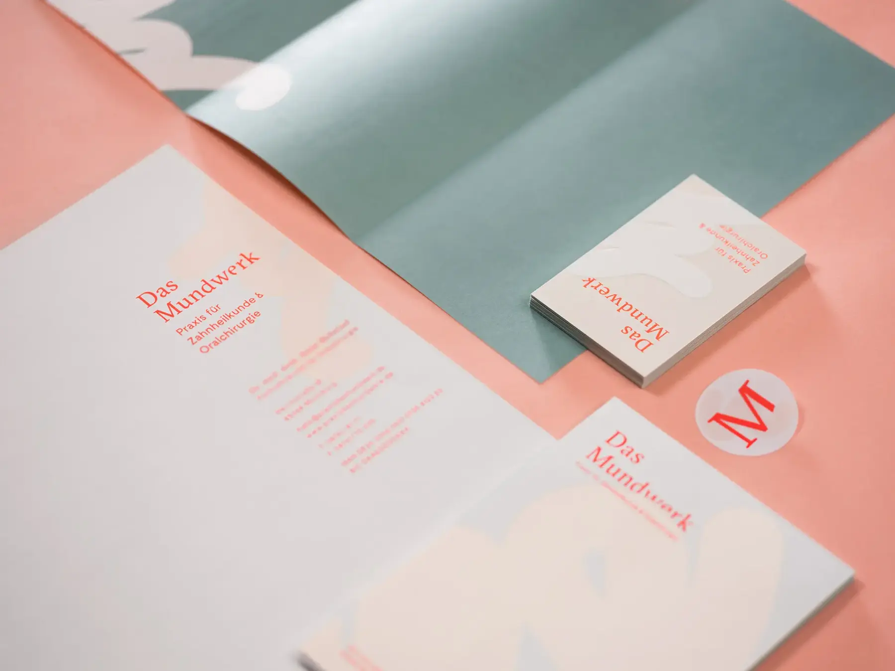 Ob vor dem 1. Date oder dem Zahnarztbesuch – auf die Tube gedrückt wird ständig. Der „Schlonz“ aus der Zahnpastatube wurde für das Corporate Design für die Praxis Das Mundwerk von Dr. med. dent. Anne Hoheisel und Kollegen in Moosburg bei München kurzerhand zum Stilelement mit Eigenleben. Das wurstartige Gebilde ziert in geprägter Form die Visitenkarten der Praxis oder in unterschiedlichen Formvarianten die Briefbögen und Terminzettel. Ein Farbkonzept in leuchtendem Neon, metallischem Mint und dezentem Cremeton macht Laune – sogar beim Zahnarztbesuch.