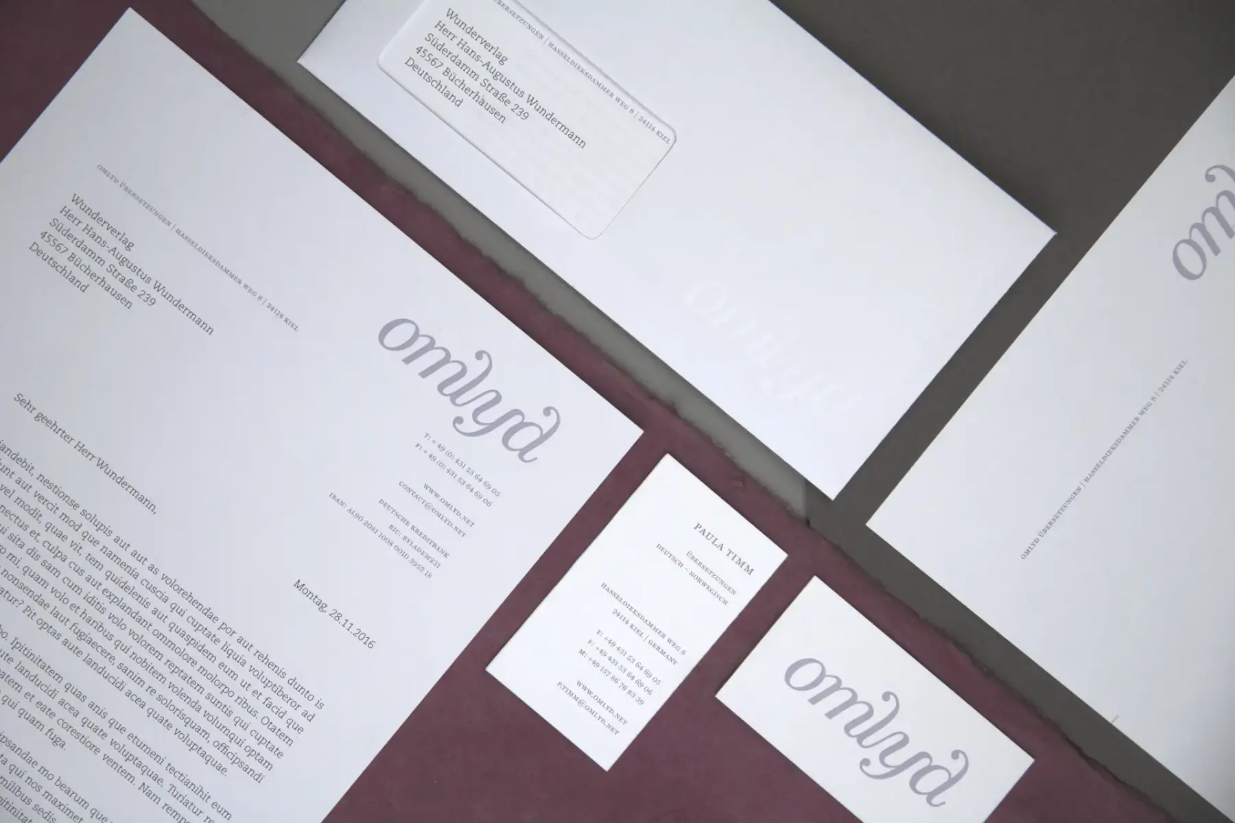 Omlyd – dänisch für Umlaut – ist ein fiktives deutsch-skandinavisches Übersetzungsbüro für Literatur. Das Erscheinungsbild, bestehend aus Logo, Briefbogen, Briefumschlag, Visitenkarte und einem Cover-Konzept für ein vierteljährlich herausgegebenes Magazin unterstützt das elegante, klassische Image des Büros.