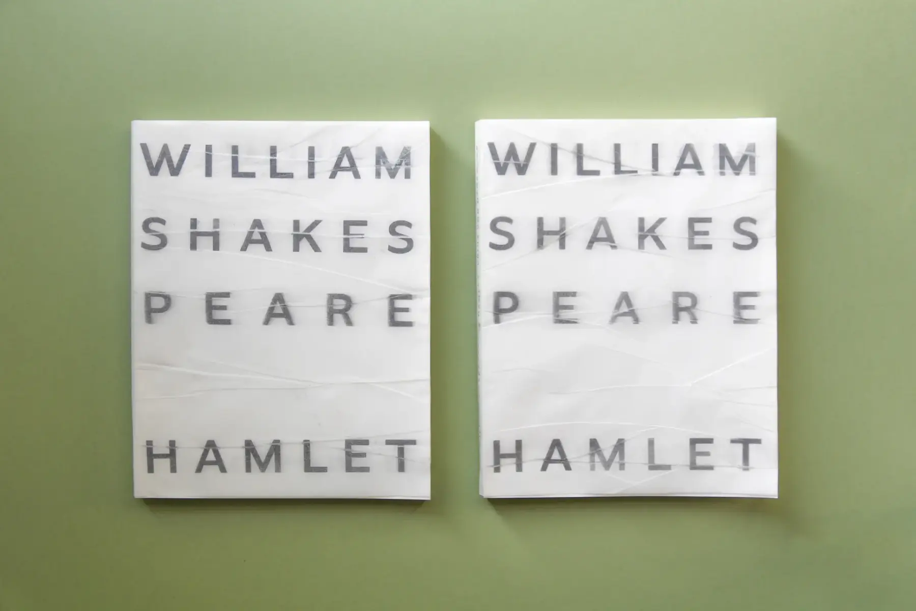 Shakespears Halmet verwandelt sich ich ein fragiles Objekt. Der bloße Buchblock, mit offenem Rücken ist in einen Schutzumschlag aus Transparentpapier gehüllt. Die Typografie des Titel ist verwischt und von den Falten des Papiers durchbochen und spiegelt gemeinsam mit dem Buckkörper die Zerbrechlichkeit der Handlung wieder.