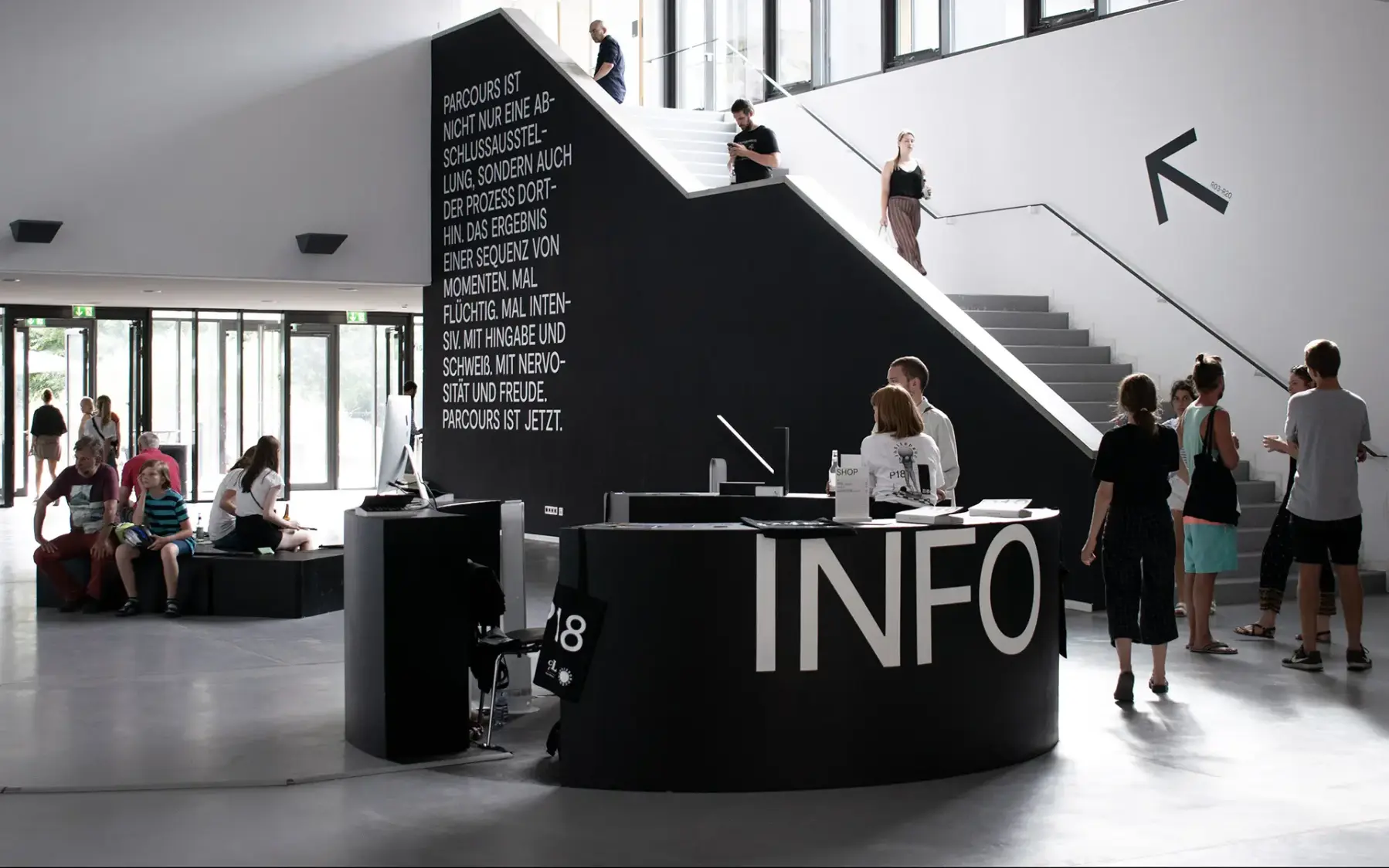 Design als Vermittler von Inhalten, Themen hinterfragen und niemals langweilig sein. Parcours lässt etwas finden an das wir glauben, begrüßt das Unvollständige, macht Fehler, macht den Computer aus und lässt Nein nicht als Antwort gelten. Hier soll Design aufregend, hinterfragend, zeitgemäß und relevant sein. Erarbeitet wird die gesamte Bandbreite einer zeitgemäßen Eventkommunikation. Ausgehend vom Ausstellungsdesign, analoger und digitaler Katalog, Teaser der Ausstellung, Absolventenporträts im Bewegtbild, Einladungen, Plakate bis hin zur kommunikativen Begleitung über Social Media.