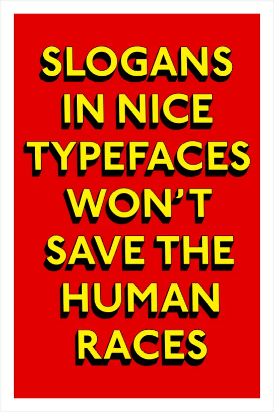 Die Ausstellung zeigt, dass Grafikdesign einen nachweisbaren Unterschied machen kann in seiner Rolle bei der Information, Bildung, Unterhaltung und Provokation von Menschen. Sie zeigt aber auch, dass sich Designer politisch verantwortlich fühlen und eine neue kraftvolle Protestbewegung unterstützen.