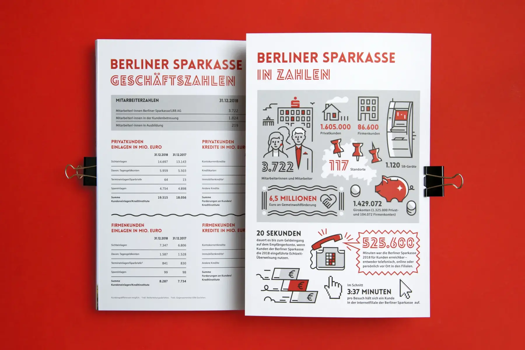 Ganzseitige Infografiken für den Geschäftsbericht 2018 der Berliner Sparkasse. Die Infografiken zeigen eine Ansammlung von (zeitlichen) Fakten rund um Berlin sowie Fakten zur Berliner Sparkasse.